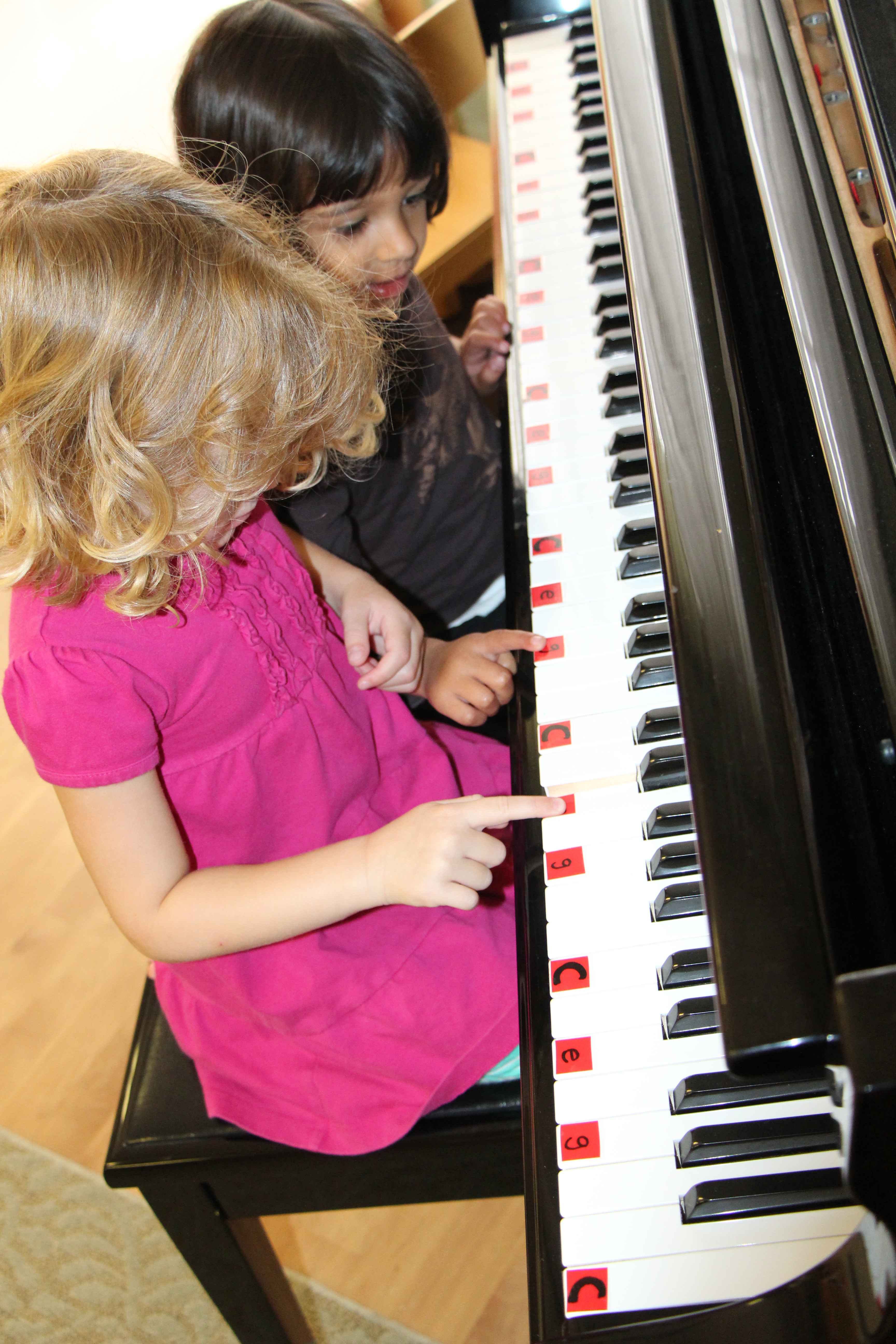 To give a piano lesson to an entire class of students can be tricky, so I brought in my electronic keyboard and placed it on the floor during circle time in order for the kids to have a good view of all of the keys. I gave a brief explanation of the difference between my keyboard and piano, mentioned the base and treble clef symbol while playing some low and high notes, and showed them how to find middle C.