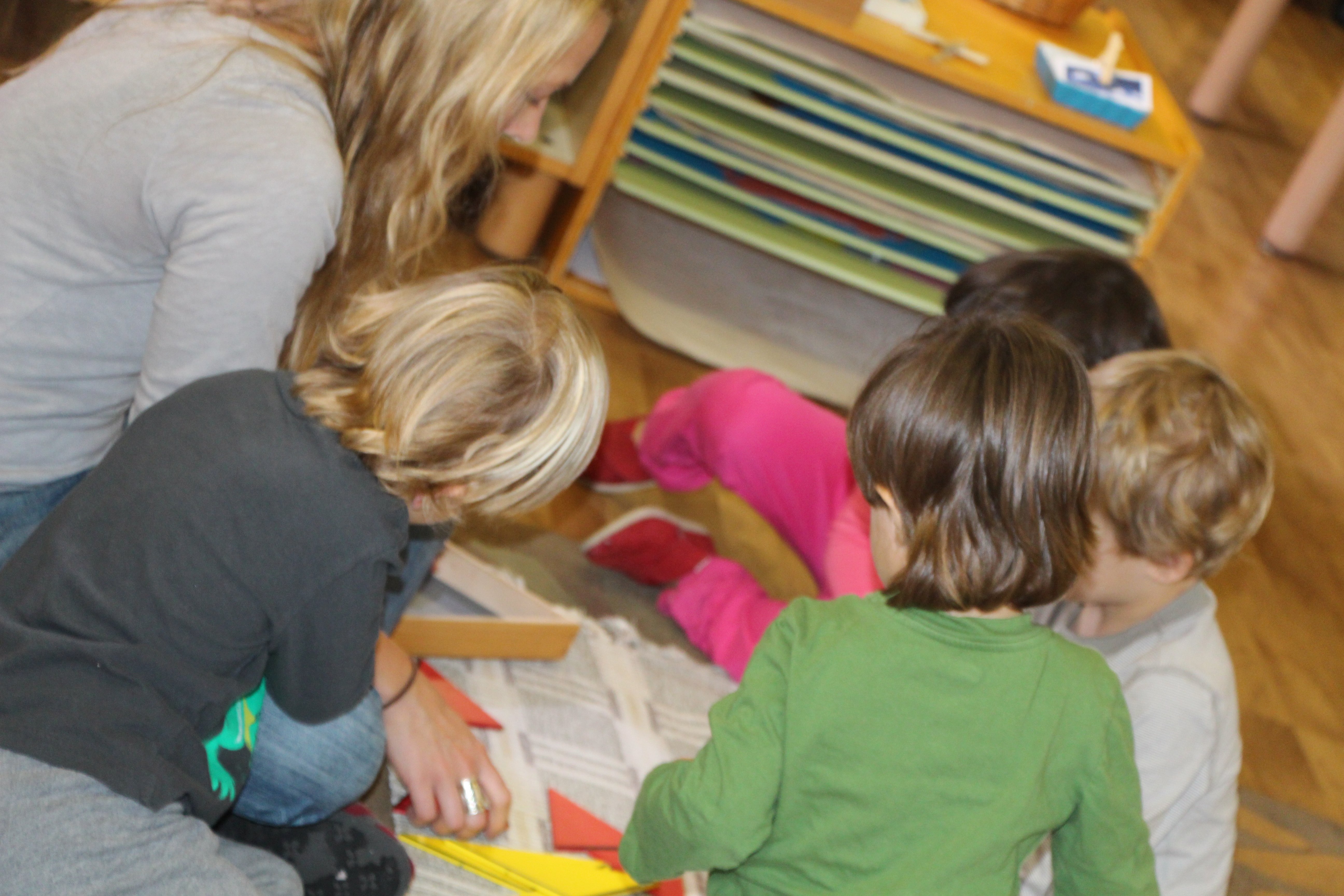 The kids seemed happy this week to be back into a normal routine, after our week of conferences and celebrations. We taught group lessons on a variety of material such as the teen boards, mixing primary colors to make secondary colors, peninsula and gulf land forms, dinosaur fossils, the United States map and the American flag.