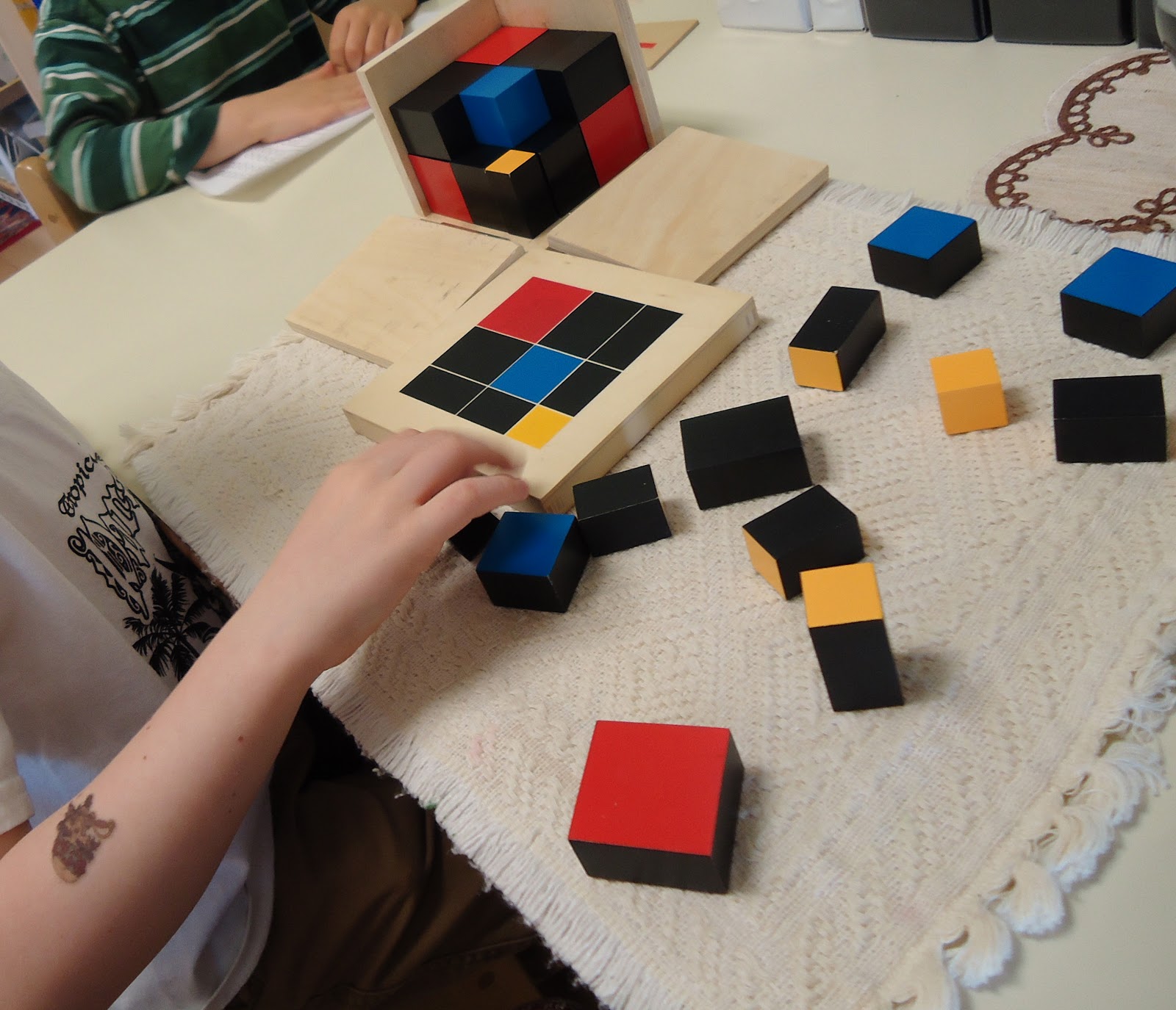 A number of activities were going on in this area during work cycle, such as color matching, color grading, binomial & trinomial cubes, and puzzles. Many kids have been observed building structures by combining the brown stair & pink tower. These children are very thoughtful about what they are building as they begin to explain the purpose of their structure. It’s always interesting to see what they come up with.