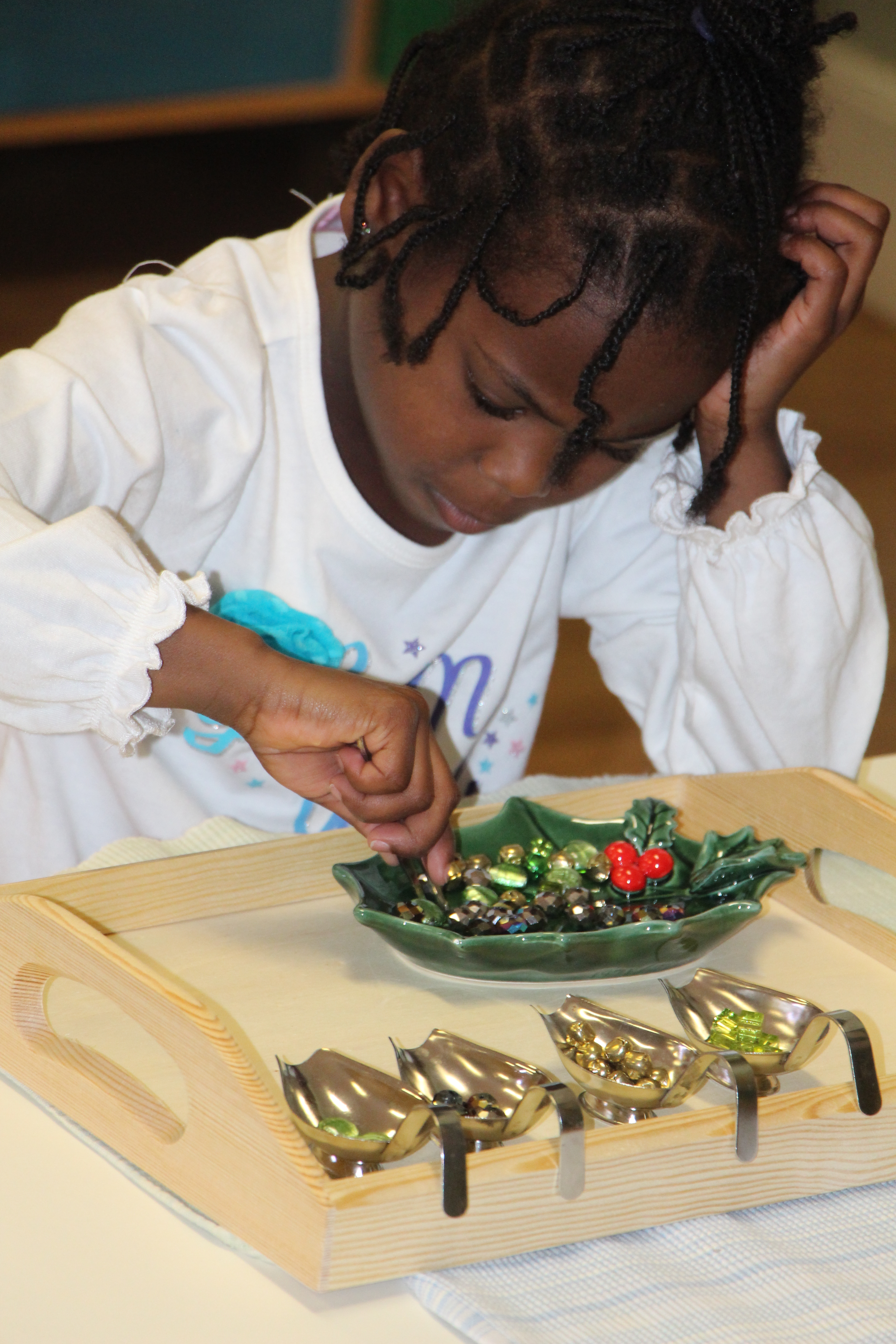 This week, the children had lessons on some holiday trays that we put together in practical life, using tweezers and small tongues to transfer with. Many children also enjoyed a funny lesson on nail cutting as we offered a paper hand with nails to trim. Many kids found it fun to decorate their hands afterward, by coloring “nail polish” and “jewelry” on them.