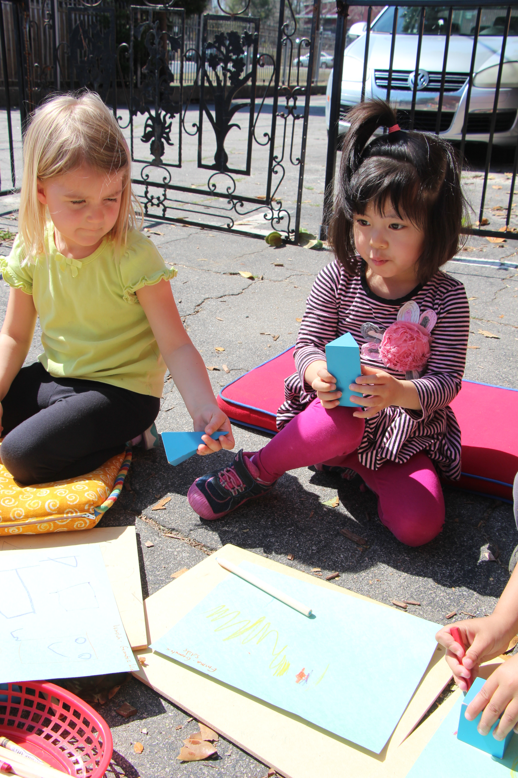In Angelique’s small groups, we focused on passing around our geometric solids, feeling these 3 dimensional shapes, and recognizing the names of shapes that make the solids.  For example, the rectangular prism has 4 rectangles and two squares.  We played memory games to learn a sphere, cylinder, cone, triangular prism, rectangular prism, cube, triangular based pyramid, square based pyramid, ellipsoid, and an ovoid.  On another day, we reviewed the names and had a drawing lesson that teaches the child to begin looking at the different shapes our eyes see when these objects are viewed at various angles.  First, Angelique took photos of the geometric solids and outlined the shapes on the photos.  She pointed out how shapes look different at different perspectives, for example, when we look at a cylinder just below eye level, the circle on the top can be drawn like an ellipse.  While not every child is going to grasp this concept right away, it got a lot of kids thinking and talking about the shapes they saw.  Many of them practiced drawing shapes while looking at geometric solids.  An additional lesson was given to interested students, training them to notice how the light source plays a role when coloring and shading our geometric solids.