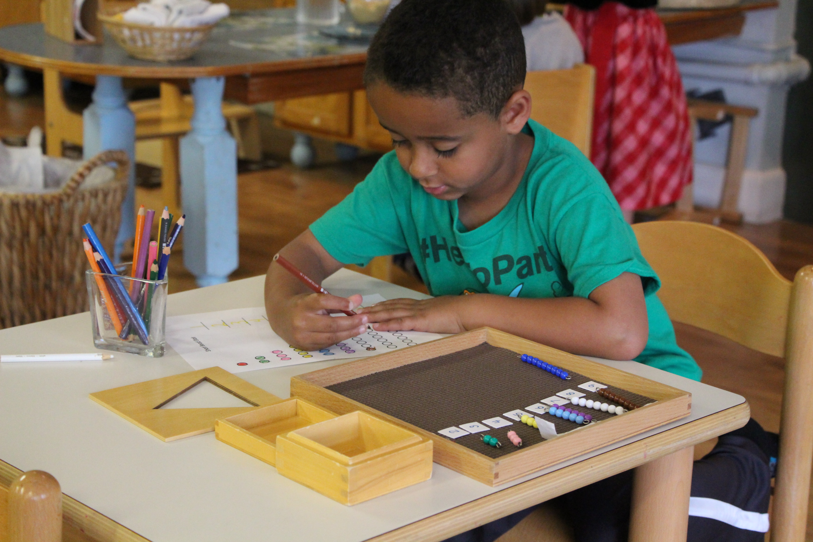 Here, Bill is working on perfecting writing his numbers while using the bead stair.