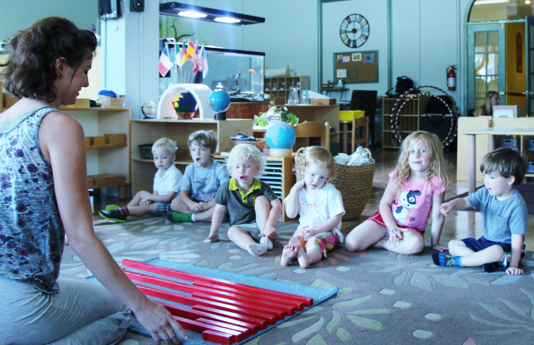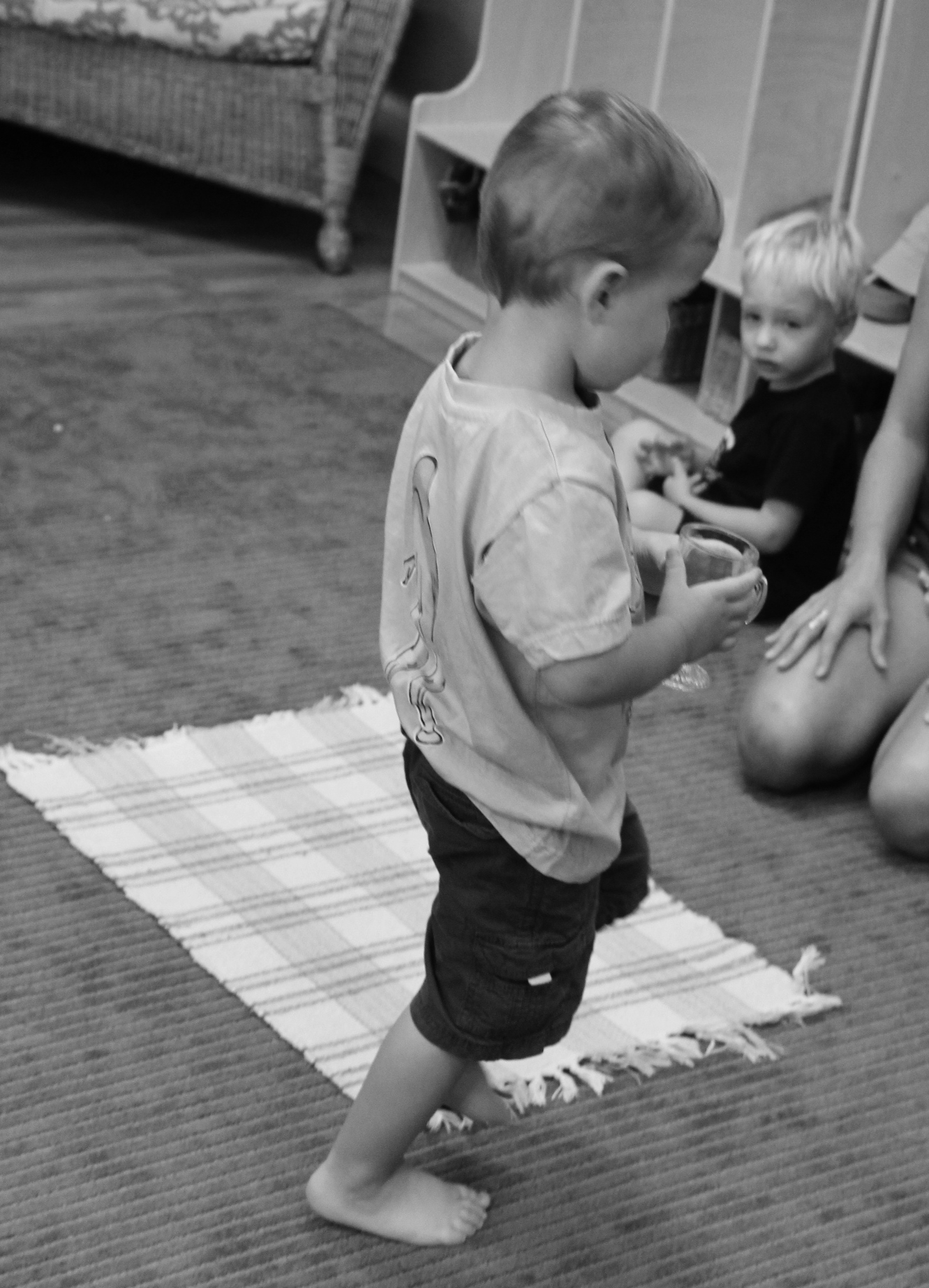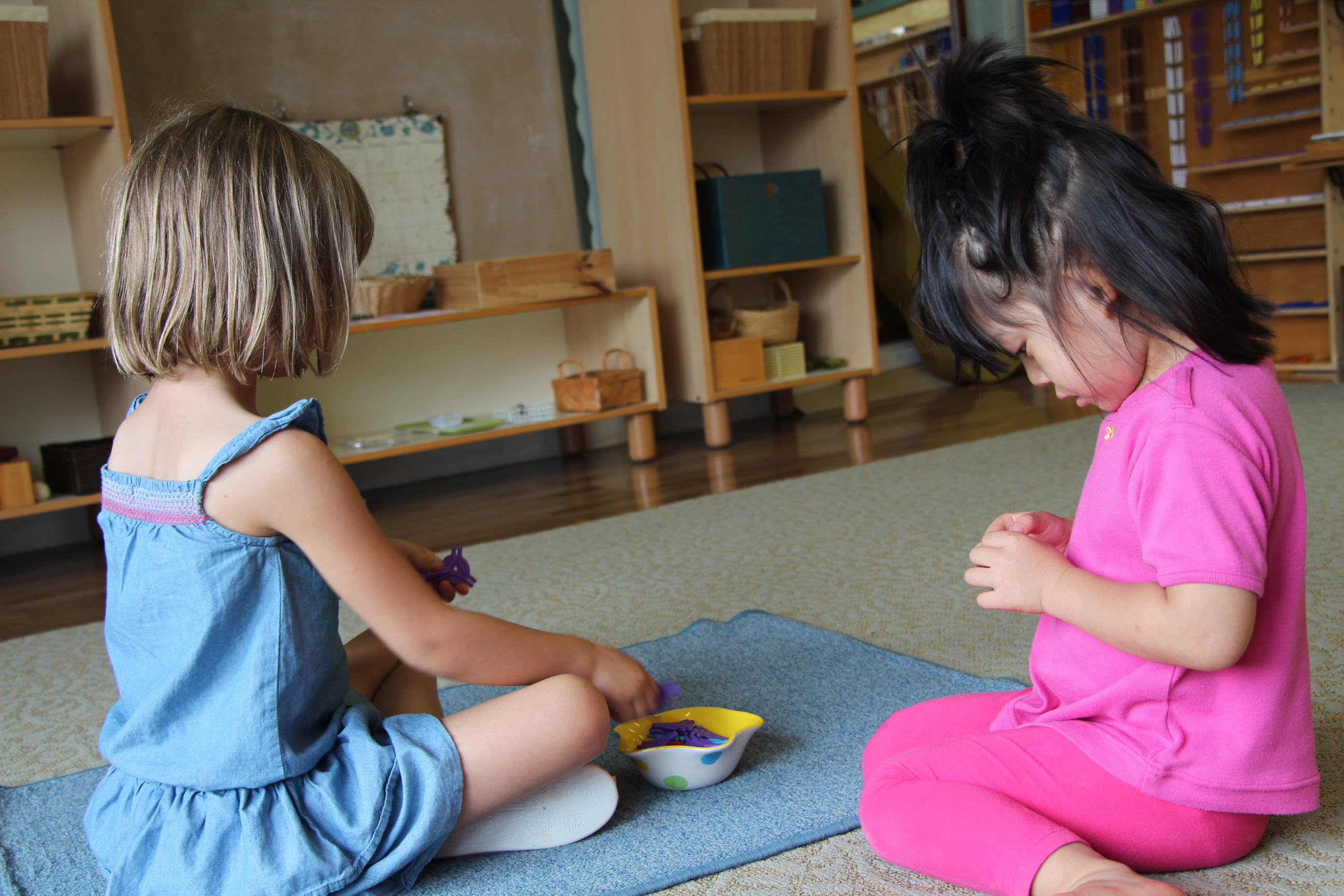 Near the end of the week, I branched off with our older students to guide them in a work cycle so that Carrie could give lessons to our new students.  It is important that we prepare these young pupils for work cycles to prevent interruption and to keep the flow peaceful and safe.  For example, Carrie gave a lesson on “walking around a rug,” to prevent students from stepping into one’s personal space while at work.  It might sound silly, but building this awareness helps tremendously in preventing others from getting upset or disrupted, crying out words of frustration like, “So-and-so kicked over my pink tower!”  Needless to say, from time to time, it still happens…  Next week, we’ll give a lesson on the “peace flower” to help resolve conflict of any sort.