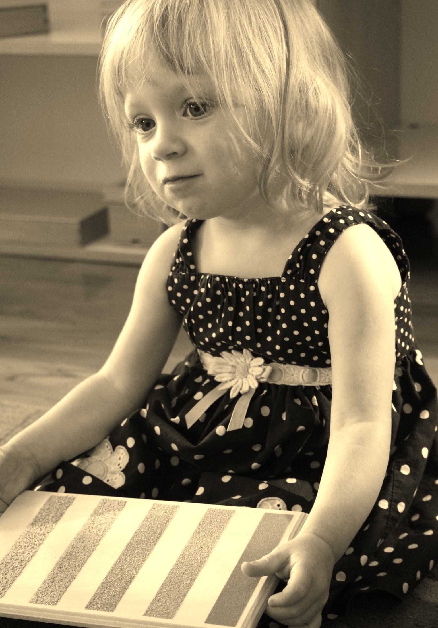 We also focused on the sense of touch by passing around the smooth and rough boards.  This is a lesson that offers vocabulary to help describe what we feel.  Below, the kids took turns passing the boards around and feeling how the sand paper gets “rougher and rougher.”