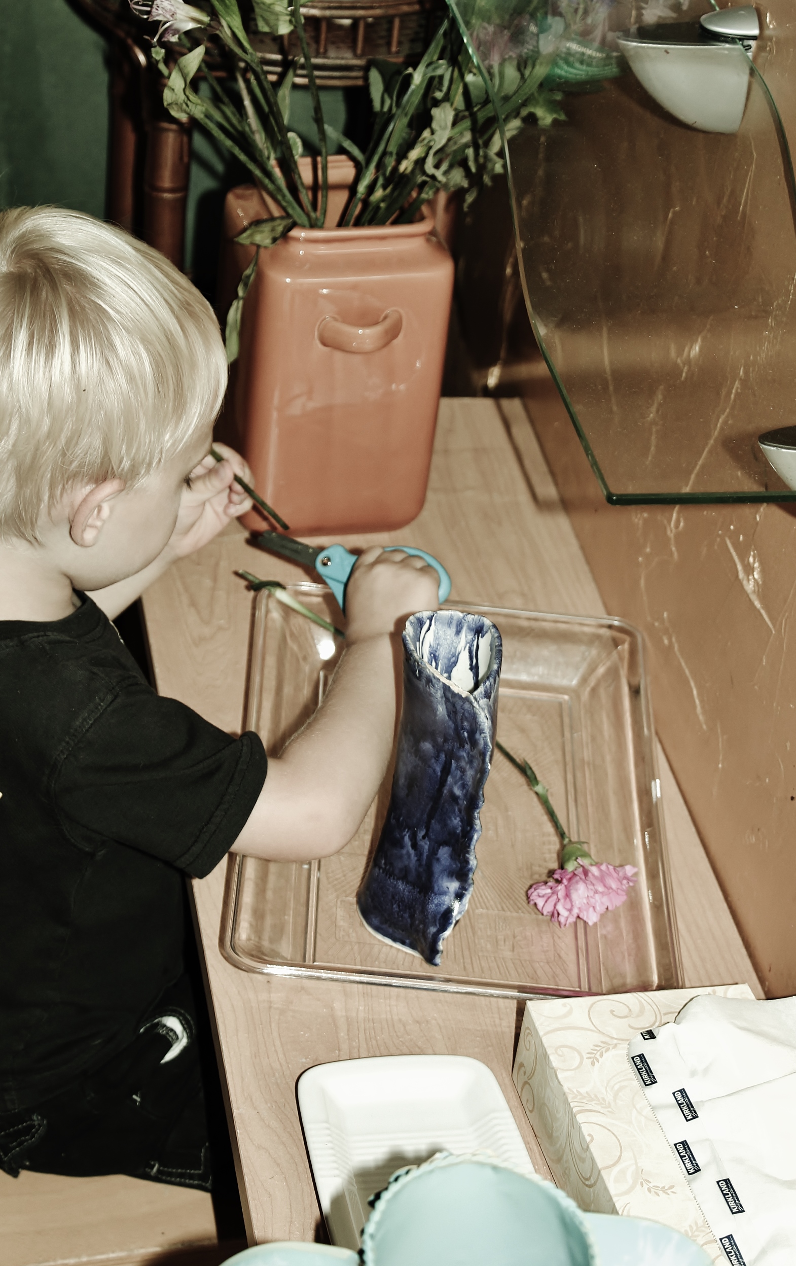 Below, Brady was working on a flower arrangement after a lesson taught by Carrie. In the first image, he is cutting the stems shorter to fit in a vase. When finished, he put his arrangement on display for others to enjoy during the work cycle.