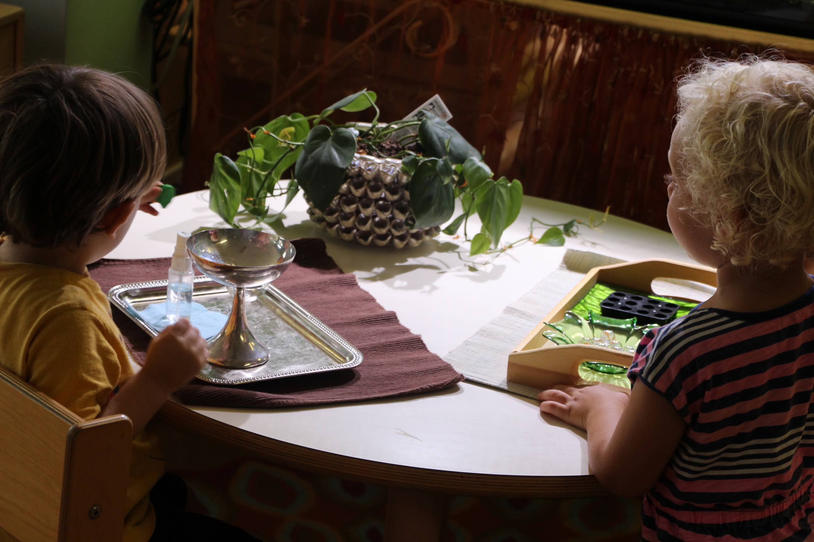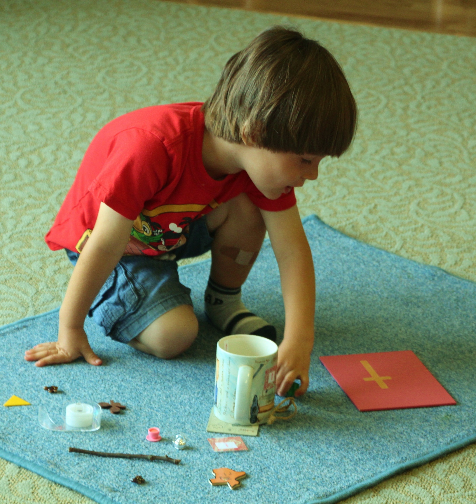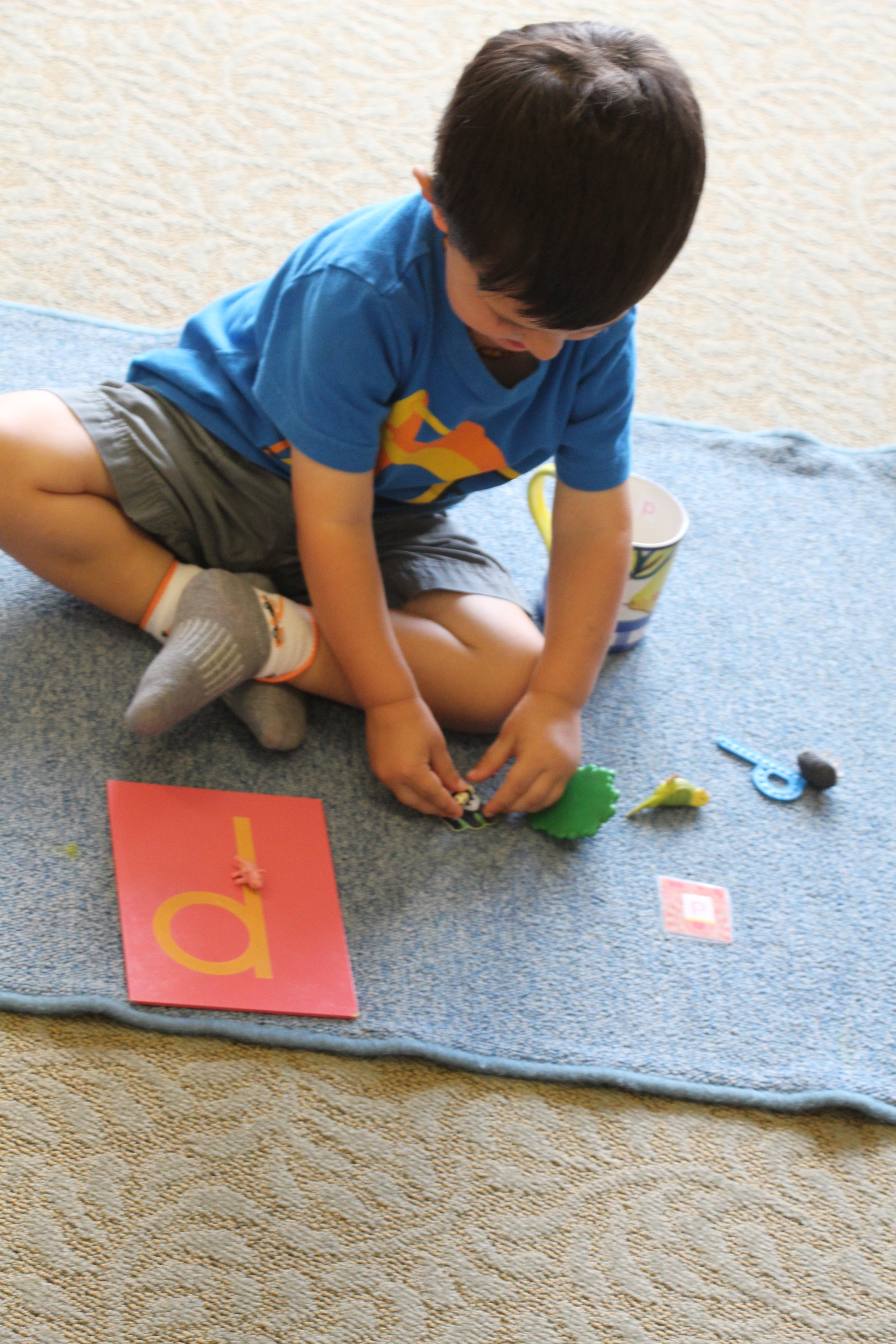 In the following image, the kids are posing for the camera during a small group lesson on the beginning sounds mugs. They were shown that they can take a sand paper letter and a mug filled with objects beginning with that letter. They are shown to practice saying the names of the objects in the mug and taking a moment to trace the sandpaper letter with their fingers, announcing the sound. Mirrors are also offered so that they can see themselves saying the sound in the mirror. Our young ones use one mug at a time and as they get older/learn more letter sounds, they may take multiple mugs and mix up the objects to sort them by beginning letter sounds.