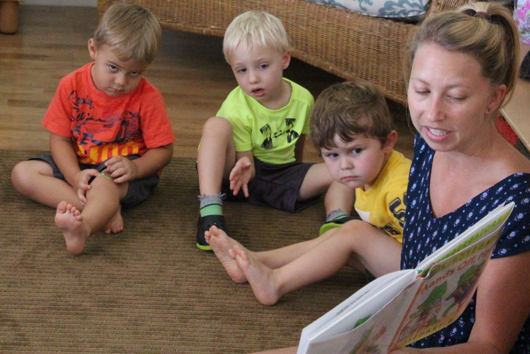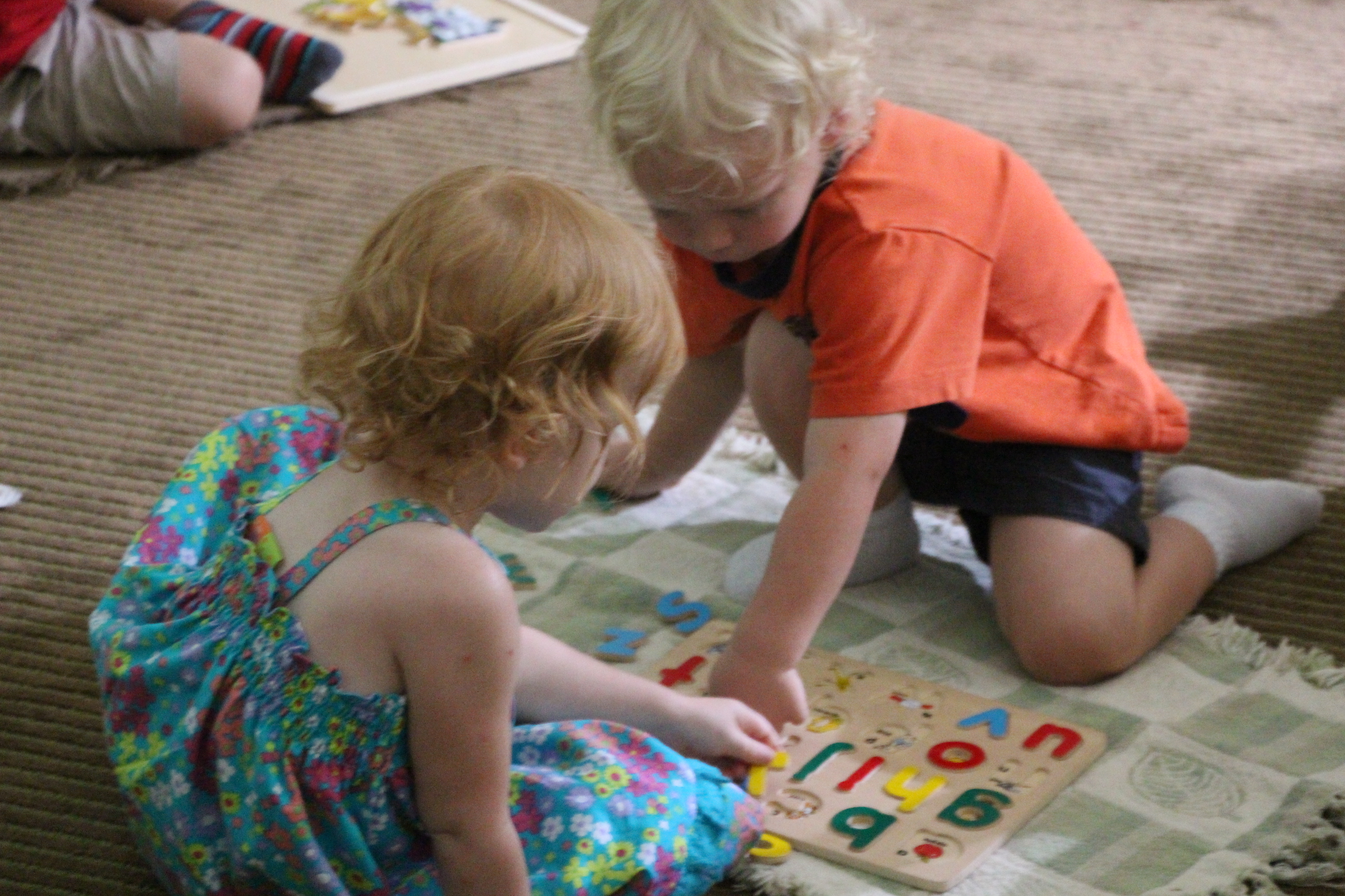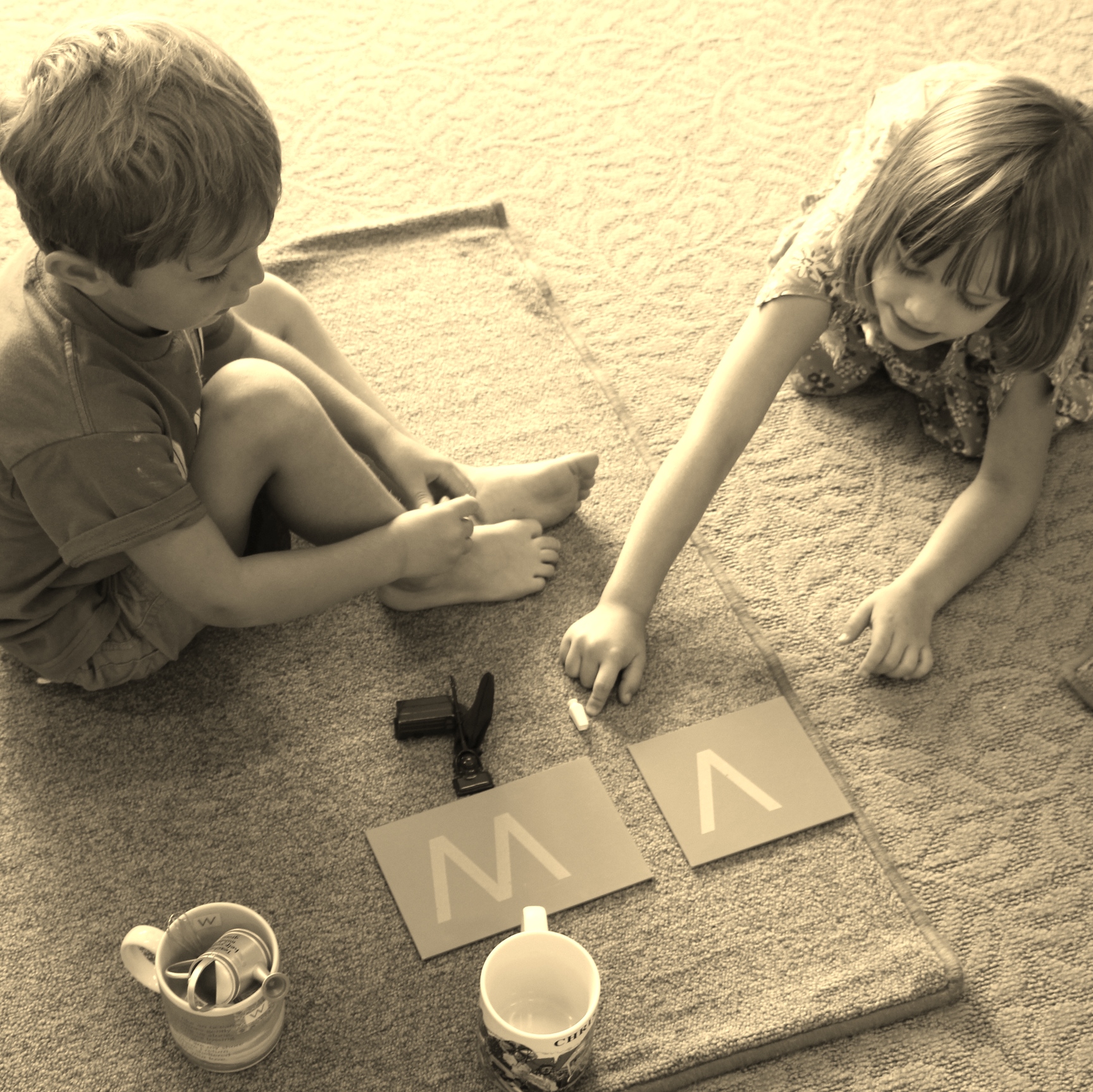 In the following image, the kids are posing for the camera during a small group lesson on the beginning sounds mugs. They were shown that they can take a sand paper letter and a mug filled with objects beginning with that letter. They are shown to practice saying the names of the objects in the mug and taking a moment to trace the sandpaper letter with their fingers, announcing the sound. Mirrors are also offered so that they can see themselves saying the sound in the mirror. Our young ones use one mug at a time and as they get older/learn more letter sounds, they may take multiple mugs and mix up the objects to sort them by beginning letter sounds.