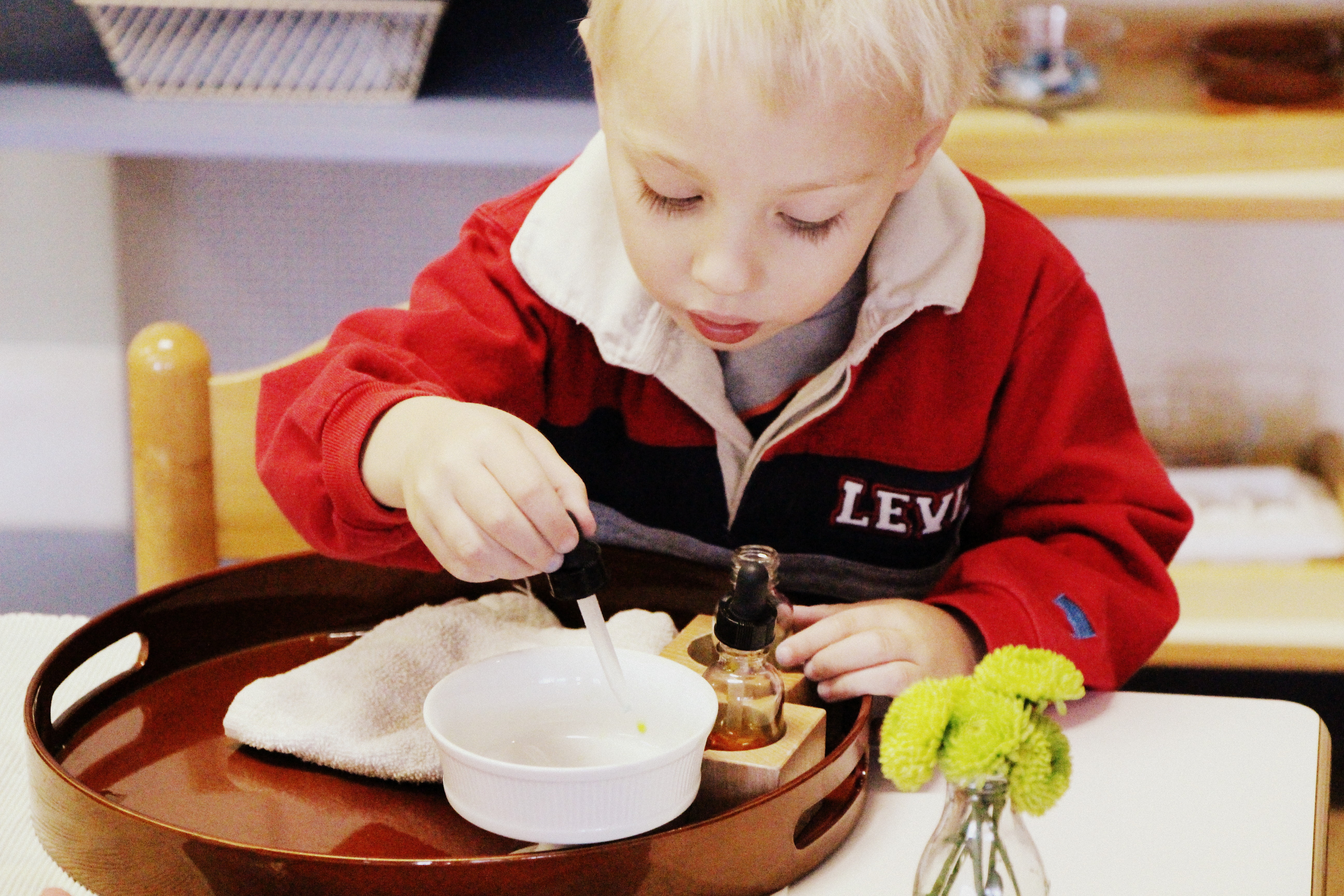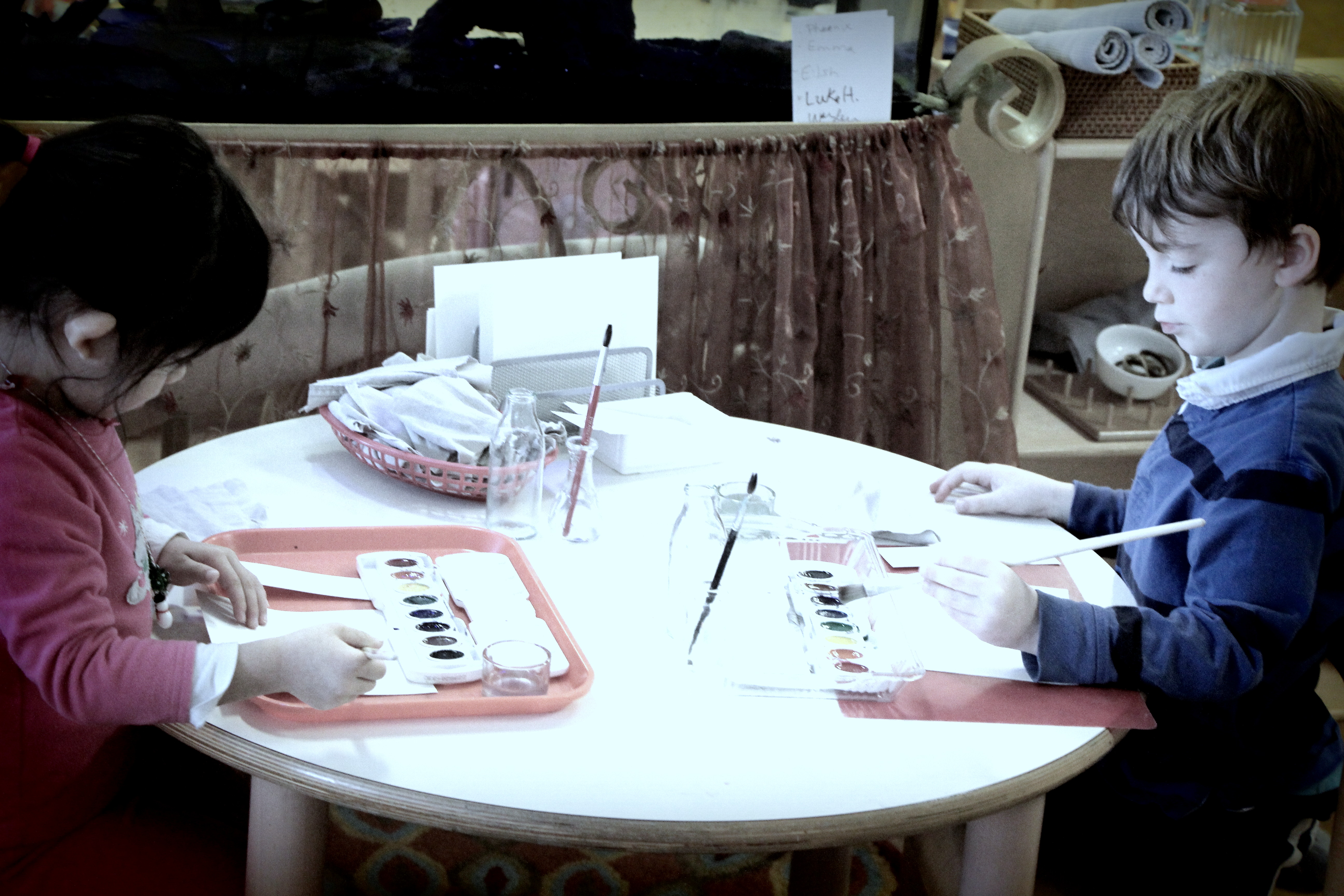 Above, students take turns at the watercolor station that we had set up for the week. Below, some students are seen working on color mixing with droppers and water tinted with food coloring. This work offers only primary colors (red, yellow & blue), so that our pupils may discover on their own how secondary colors are produced.