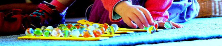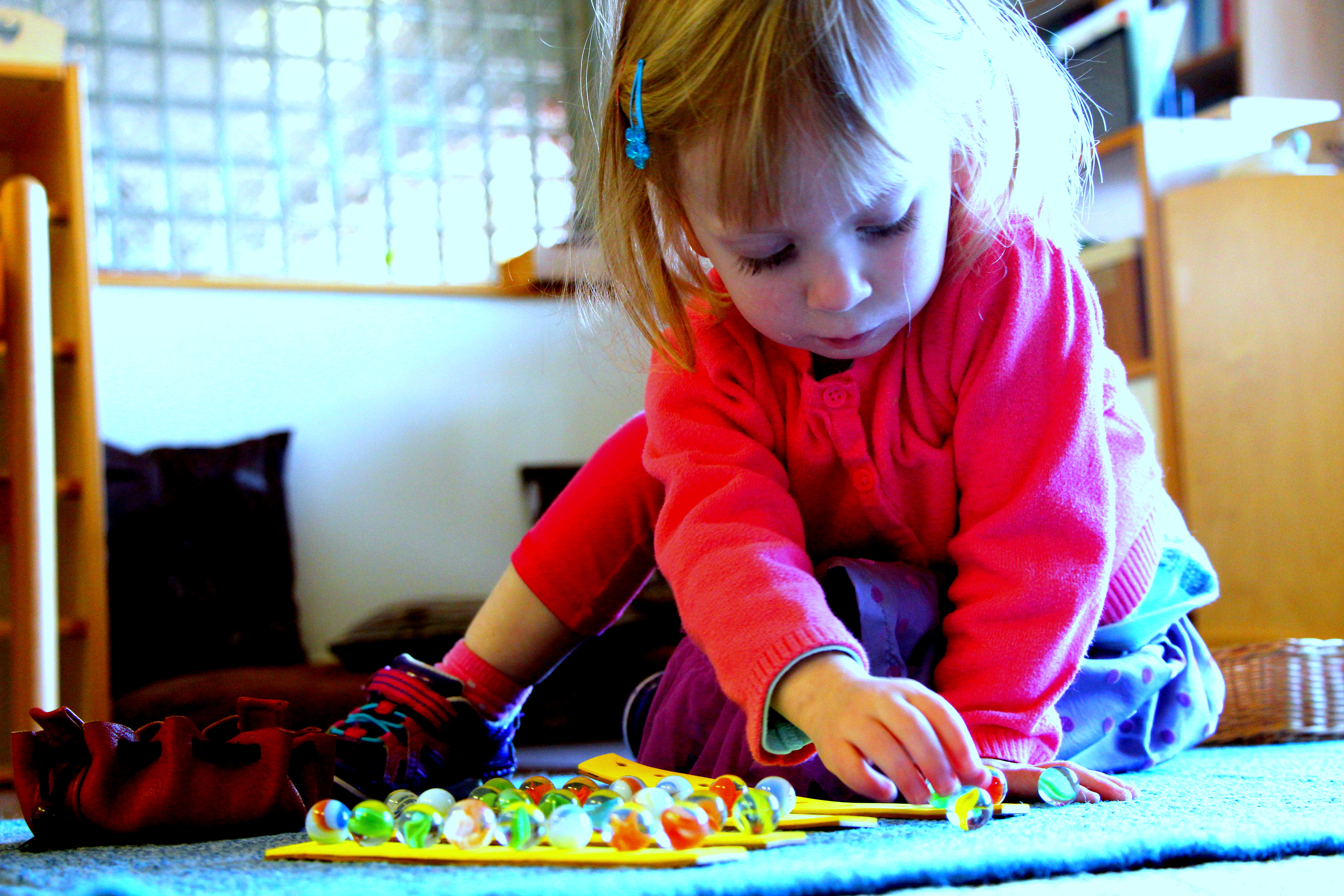 During work cycle, Wyatt and Eilish carefully count out marbles from the new math work presented by Linnea.
