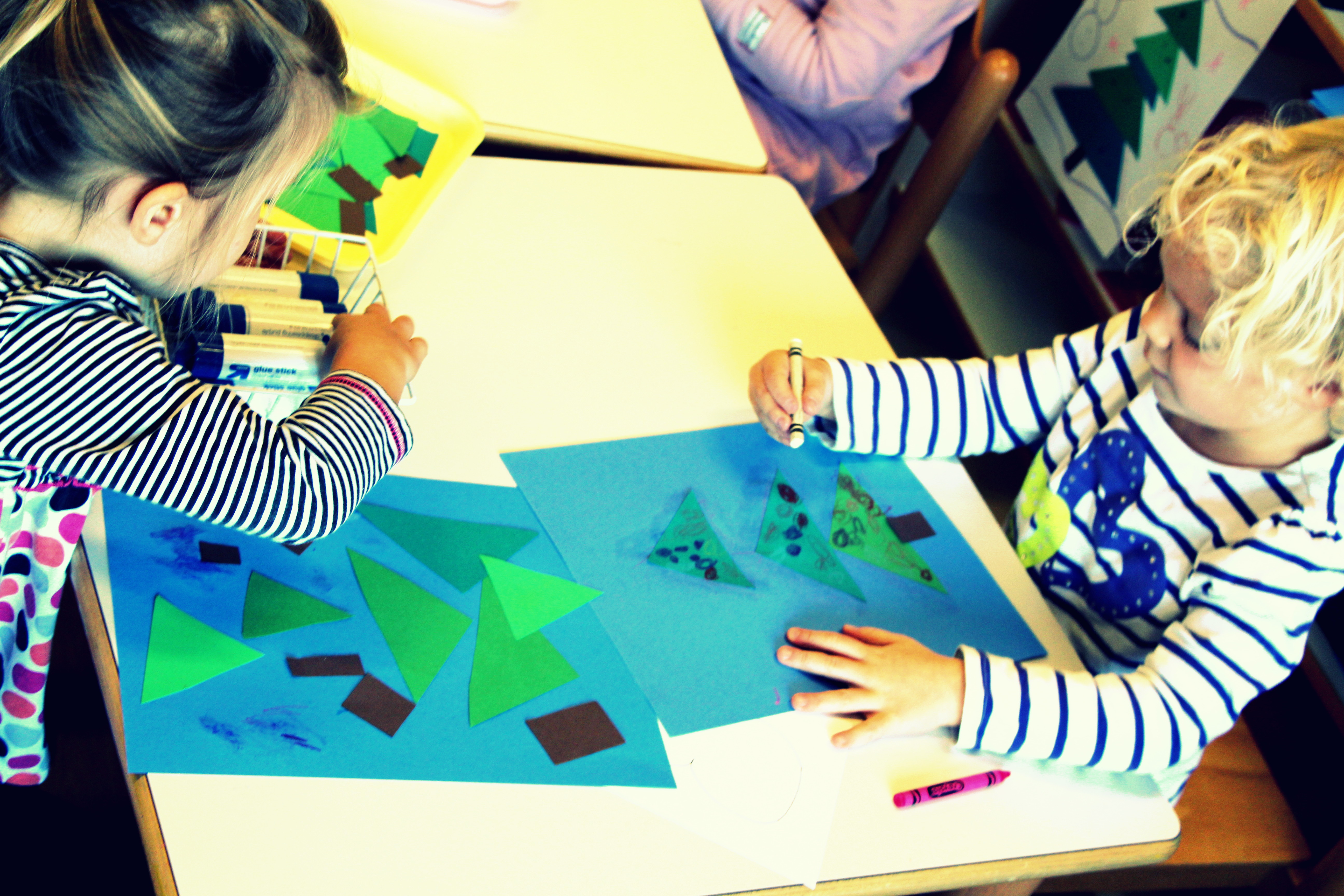 The artist in me always comes out at this time of year, so I had some crafty ideas in store. During group time, we had fun discussions on some abstract artists and what makes art “abstract,” followed by a simple linear drawing lesson to create abstract art out of seasonal subjects.  I also had a table set up with glue and “paper snow,” i.e., circle and oval cut-outs, to create fun winter scenes, along with various sized triangle cut-outs to build trees however they like, etc.1 holiday artsnow art