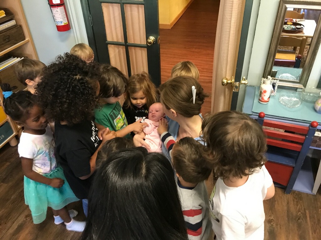 First off, while I have been on maternity leave, I have been itching to be around my Indigo family, so at the beginning of last week I decided to gradually work my way back into the studio by coming in at least a few times a week to observe the students, offer new lessons, follow up with Anisa, and begin evaluations for conferences. On Monday of last week, I brought my baby Edith in for the kids to meet her (plus I wanted her to meet Miss Luisa, the infant teacher, since she will be joining the infants room shortly). Our students were all so excited, and Edith was very calm, observant, and comfortable– as if she knew them already… Cristina commented to the children, “I think she knows all of your voices from when she was still in Angelique’s belly,” and they all seemed tickled by that thought 🙂
