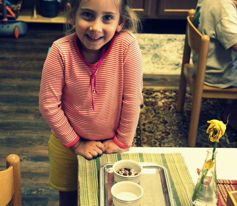 Our students love the freedom of serving themselves during the work cycle. Snack time is a great time to practice both independence and one’s social skills. We had lessons early on that demonstrated how to self serve, ways to eat politely while conversing with peers, and and how to clean up after one’s self.  As you can see below, we have a buffet style snack set-up. Our students follow the labeled quantities of food that they may take from each dish, with an understanding that this food has been measured ahead of time so that each child in the classroom may have one serving. Children practice pouring their own water as well as cleaning up accidental spills. They are responsible for the space where they eat, keeping in mind to tidy up for the next group of students. Our students take pride in this area as it is an opportunity to show their independence when it is their turn to take a seat and eat 🙂