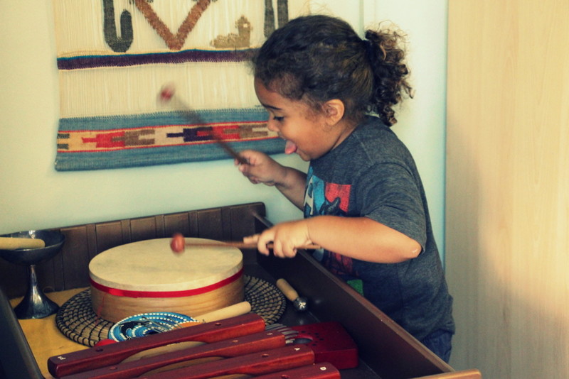 We are always playing music in our studio… Classical and different styles of instrumental music is a Montessori staple as it serve as great background music during the work cycle, but we also like to teach our kids about different ways to make music. Some of you already know about my approach if your child has been in this studio with me for a while, but let me quickly mention for the others how this lesson works: Our color coded bells are used to to introduce sheet music as kids learn to recognize the C scale and they can see how the notes move up on the lines of sheet music, getting higher as we reach the octive. I also will be starting the color coded chord system in the new year with the piano again, which is always a hit 🙂
