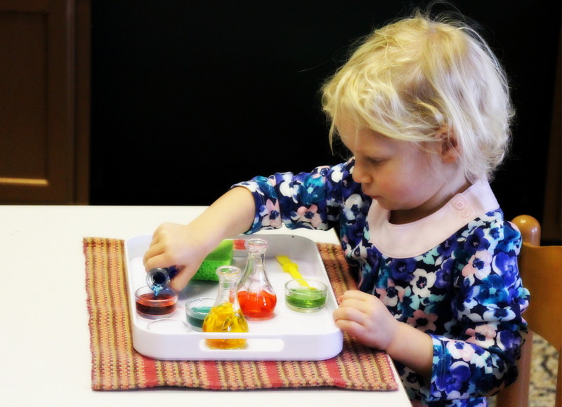 Color Mixing. Miss Anisa recently gave a presentation on mixing our primary colors to make secondary colors. The kids have so much fun every year with this one as they feel like little scientists mixing food colored water.