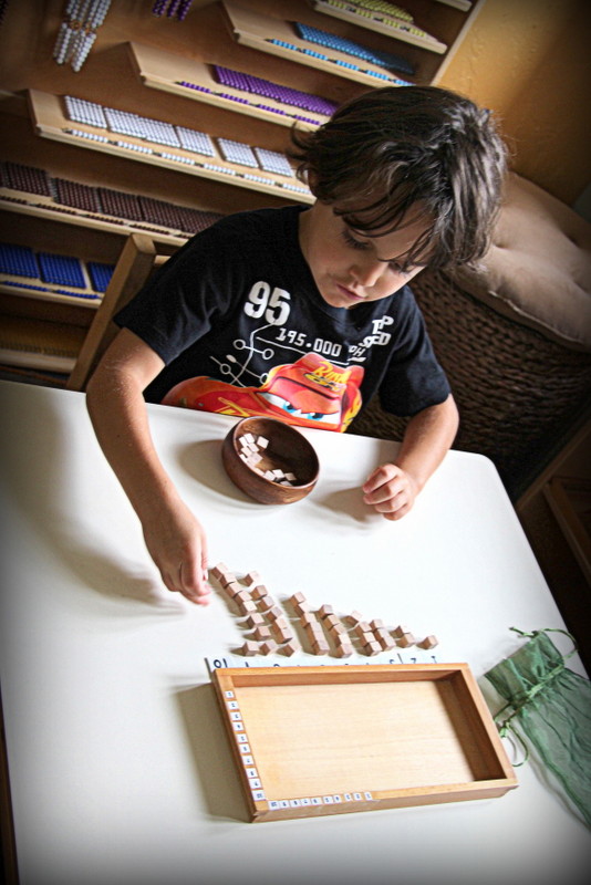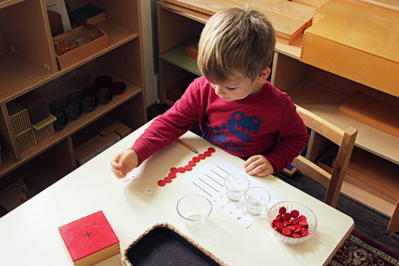 Our older students who are graduating soon have been working on math extensions with hands on counting material to solve simple equations. Many students of various ages are also trying out material with teens, and some are interested in counting out the 100 board. There are so many different directions you can go to apply math in our studio.