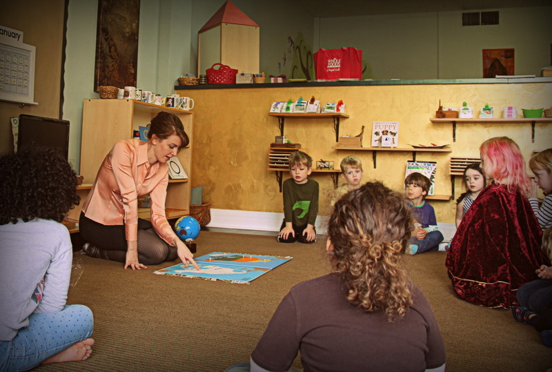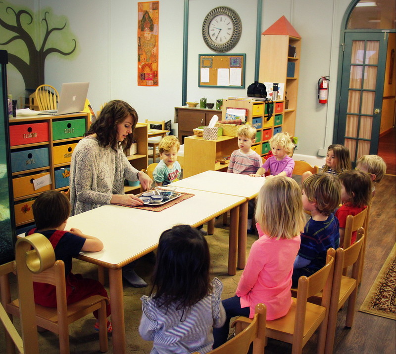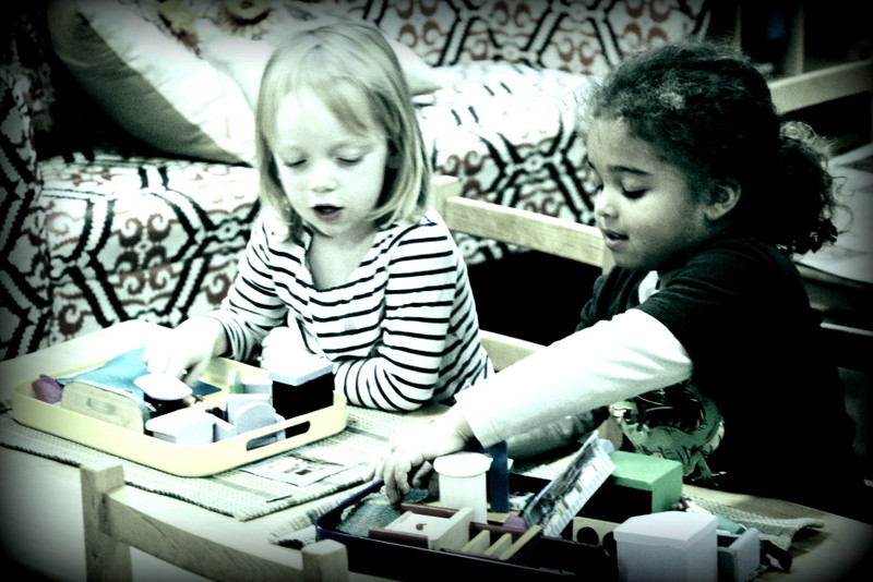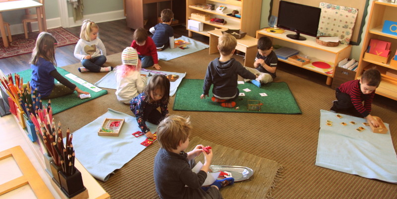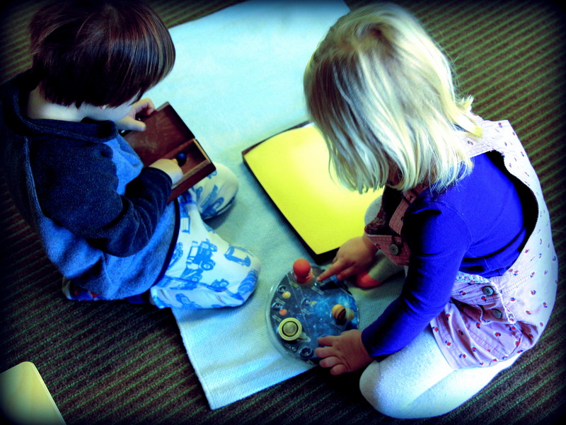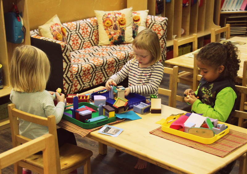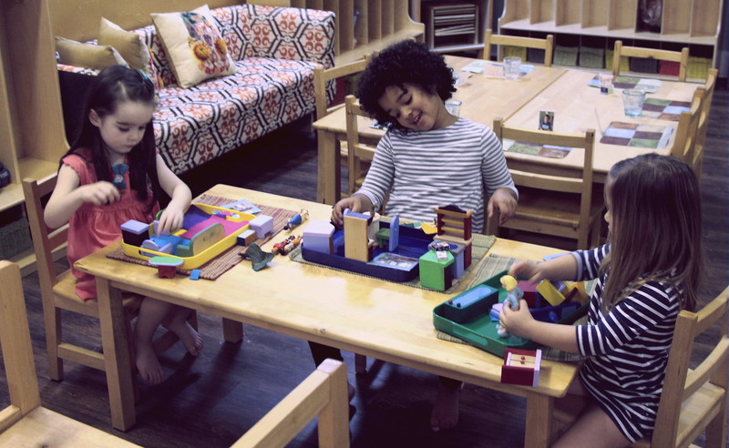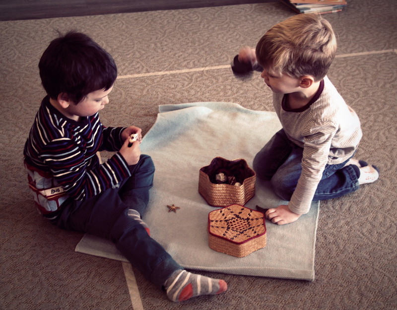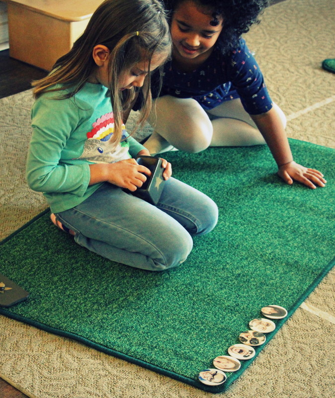 Given that we have a class of 3 through 5 year olds, we are frequently checking in with the students, reminding them that we are all at different levels of learning. Our older students who have been in this studio for 2 to 3 years especially have a good understanding of the fact that our younger friends are still learning to use their words, they have a lot of lessons to go with handling much of the material in the classroom, and each individual is working on their own challenges. Sometimes we have little “meetings” with our older students off to the side, reminding them that we need their help to make our first-year students feel comfortable and welcome, and to also be patient with them as they are learning to find their words, they need help and reminders about the ground rules, etc. We have small group discussions with our youngest students to give them advice on how to be patient with each other, offering opportunities to practice grace and courtesy. We practice through role-play by making suggested responses to scenarios that we see on a regular basis. It is important for us to check in with our students throughout the day to assure that they are being kind to one another by listening to each other and working together. If we notice some children working through a conflict, we tune in to see if they could use any encouragement from us to keep a conversation going as they find their gentle words to resolve the situation and end on a peaceful note.