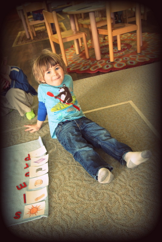Our first and second year students are always being exposed to language material, they have heard the common letter sounds of the alphabet at circle times over and over again, and they are practicing some fundamental material that also teaches vocabulary words of the common letter sounds. Some are into tracing a little sooner than others, some are sitting in on older group lessons on occasion, some are more interested in math or science, and some are just happy trying a little bit of everything – I mention this because there is no right or wrong as to which order your child is learning the material in our classroom. We do not want to push them or stress them out when there is no need to do so. The Montessori method offers opportunities for growth along the way that naturally draw our students to more language material when the time is right. We want them to have enjoyable experiences trying a little bit of everything, whether the concept registers or not, as this experience will better equip them for the day we start asking them to start focusing more in certain areas.