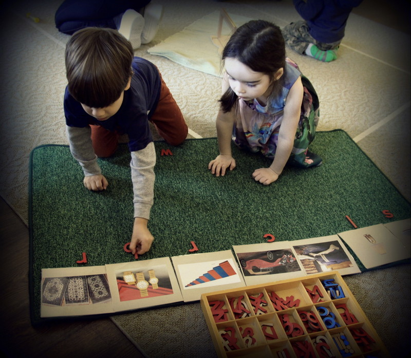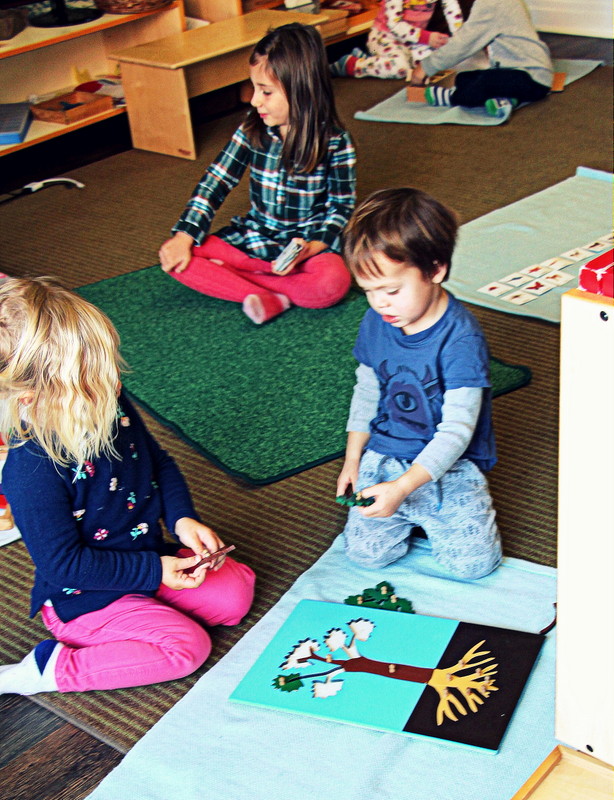 During work cycles, we check in with our students and offer brief hands-on small group lessons on Montessori material. We like to use the wooden alphabet and imagery to introduce beginning sounds and word building.