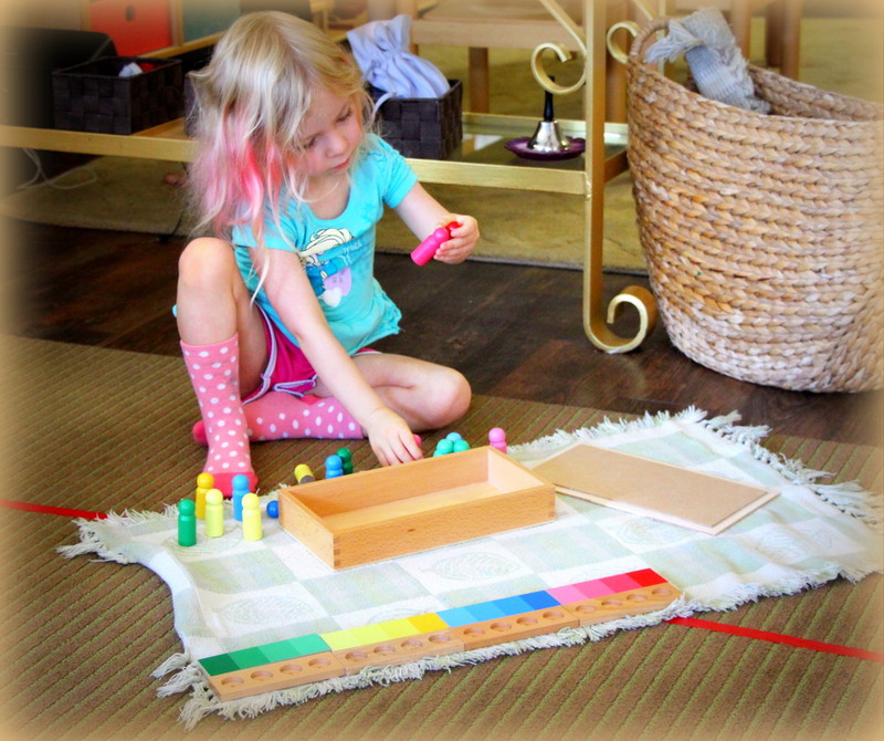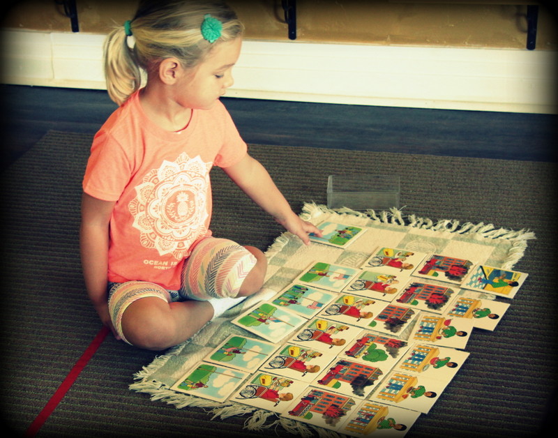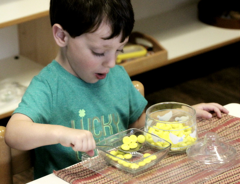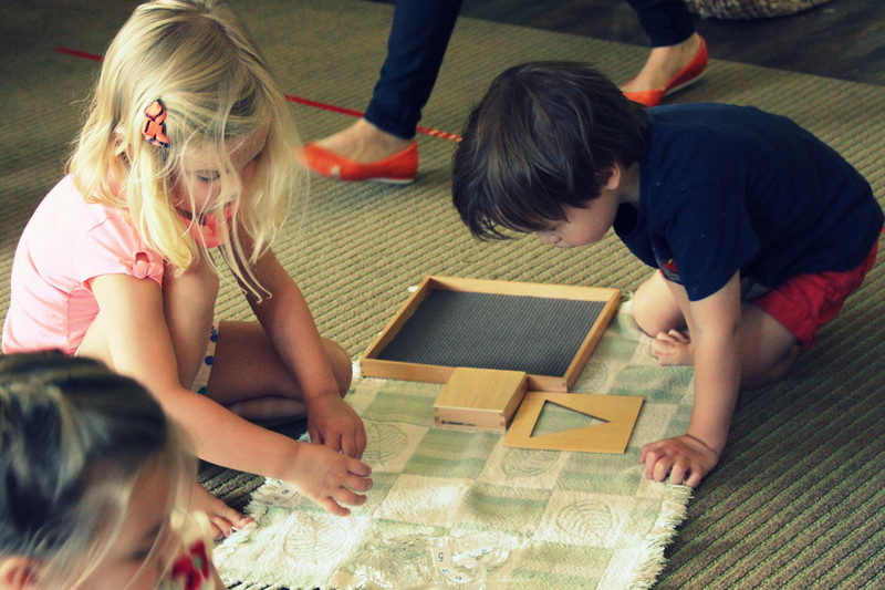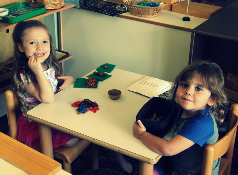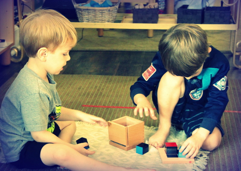First off, each material that is prepared on the shelves for our students is called a “work.” During our work cycles, we are encouraging independence as each child chooses a work, carefully transferring it from the shelf to their rug or table mat (which are used to help a child recognize their personal space). Work cycles continue to happen on a daily basis, a time when our students can explore and work on material that they have had lesson son. This is a peaceful and productive period where our students work independently or in small groups. While working independently helps children to focus and refine their motor skills, working with others requires patience as children practice their social skills to take turns and problem solve with one another. The images below are recent photos from some of our work cycles. You can see various students working at their own pace with no interruptions. They take their time and thoughtfully work on material, and when they are finished and satisfied, they clean up after themselves and put the material away in its special place.