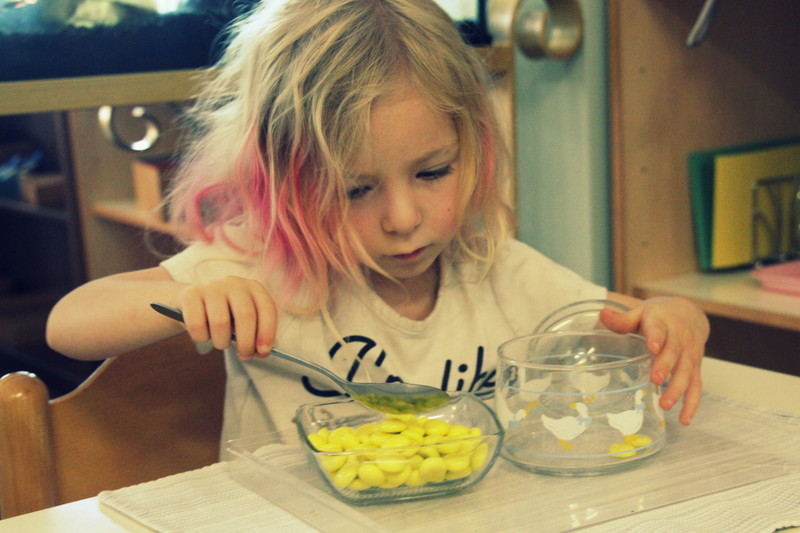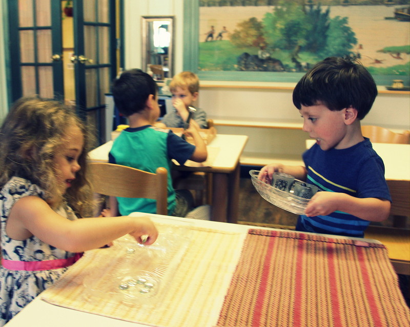 Our students love the freedom of serving themselves during the work cycle, and we teach them how to do so during small group lessons. As you can imagine, snack time is a great time to practice both independence and one’s social skills. During our lessons, we offer role play to show how to eat politely while conversing with peers, as well as how to clean up after one’s self.