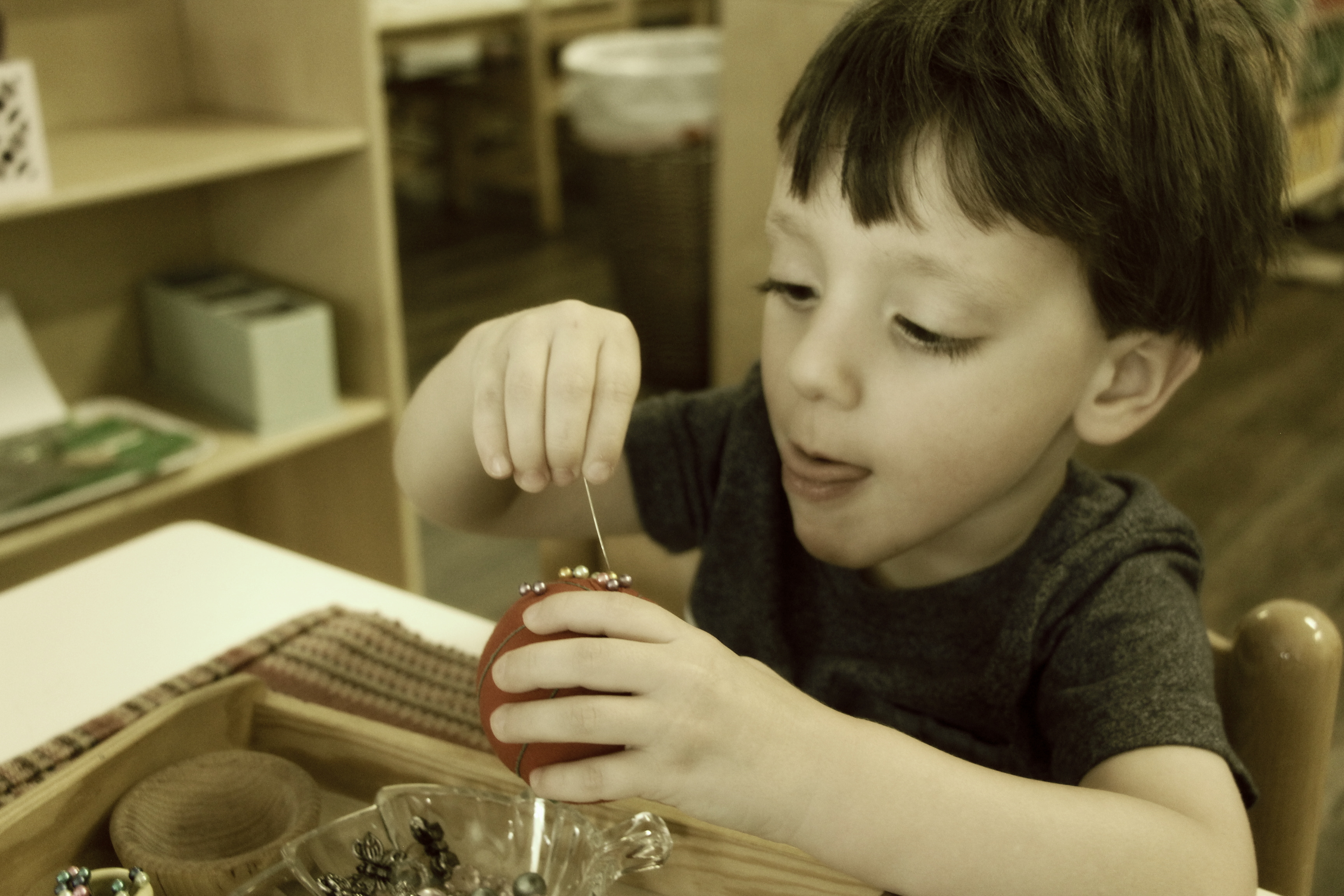 Seamus carefully pushing sewing pins into a pin cushion, a fine motor skill that helps children to find their pincer grip.
