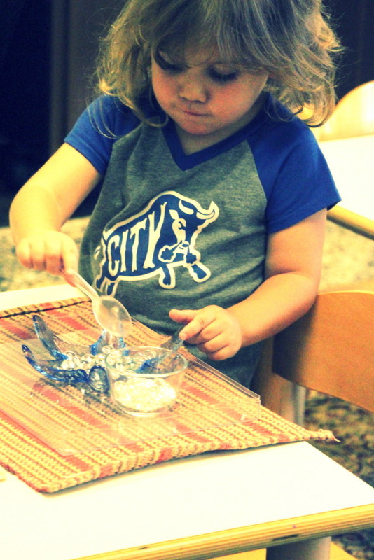 This repetitive work that requires holding small tongs to transfer marbles from one cup to another is great practice for strengthening a child’s fine motor skills.