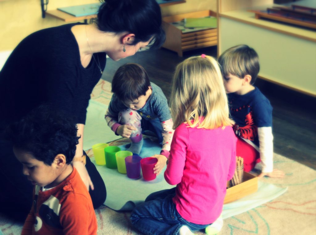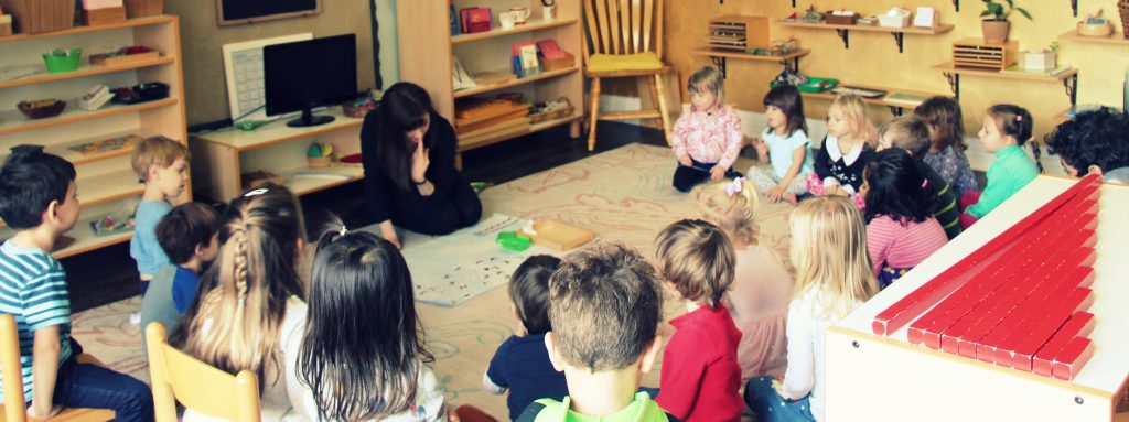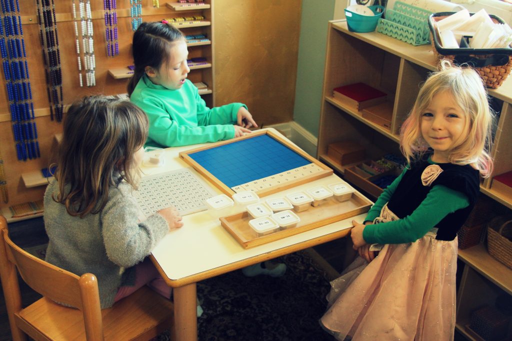 During work cycle, students enjoy the fun little story-telling objects in our “beginning sounds mugs” as they practice saying words that begin with a common letter sound. The pink letters boards above are Montessori materials called “sandpaper letters,” which the children are shown to trace with their fingers and sound out the most common phonetic sound. This is a prerequisite to writing as children get a sense for the lines and curves of lowercase letters.