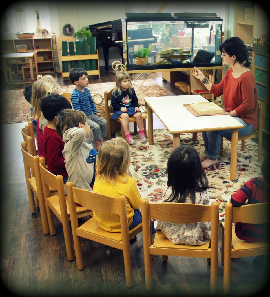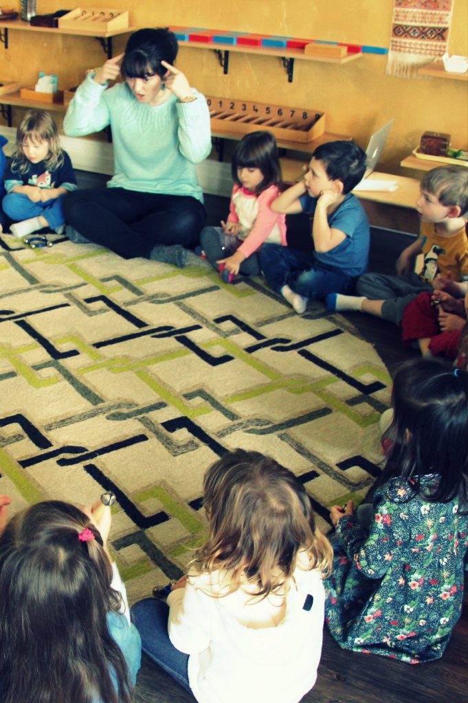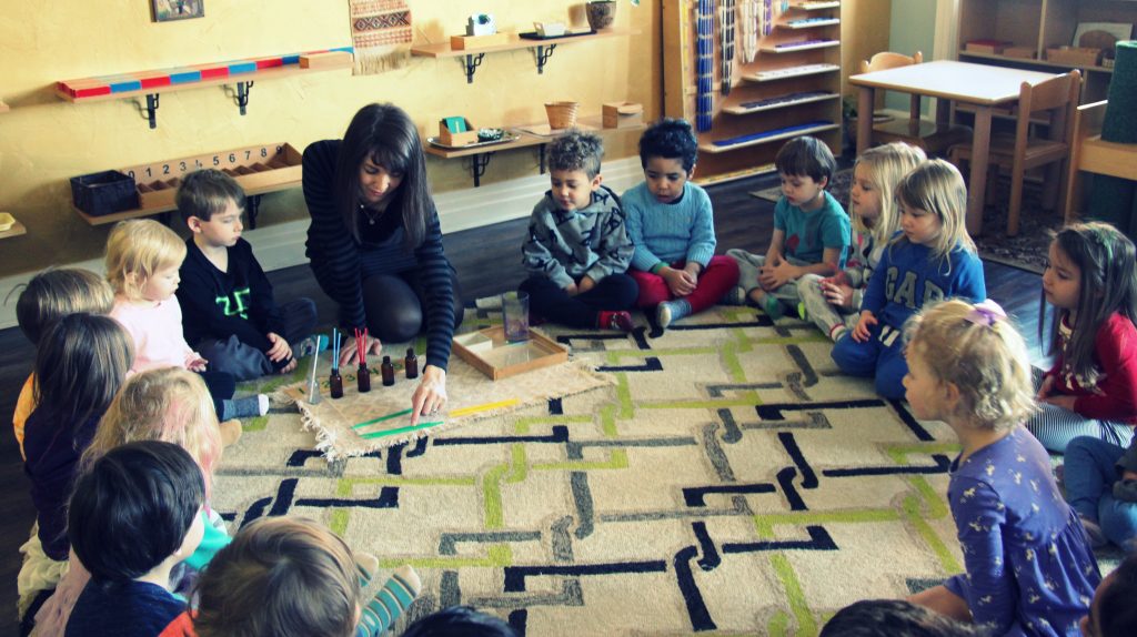 Lessons are given regularly to go over practical life material as these items are not toys – they are tools to learn, and the material could potentially be dangerous if items are misused. Above, Ms. Addie demonstrates a productive and safe way to use the material.