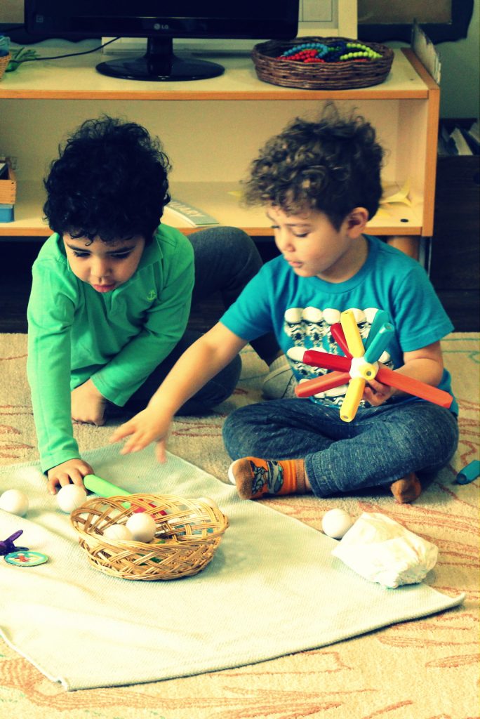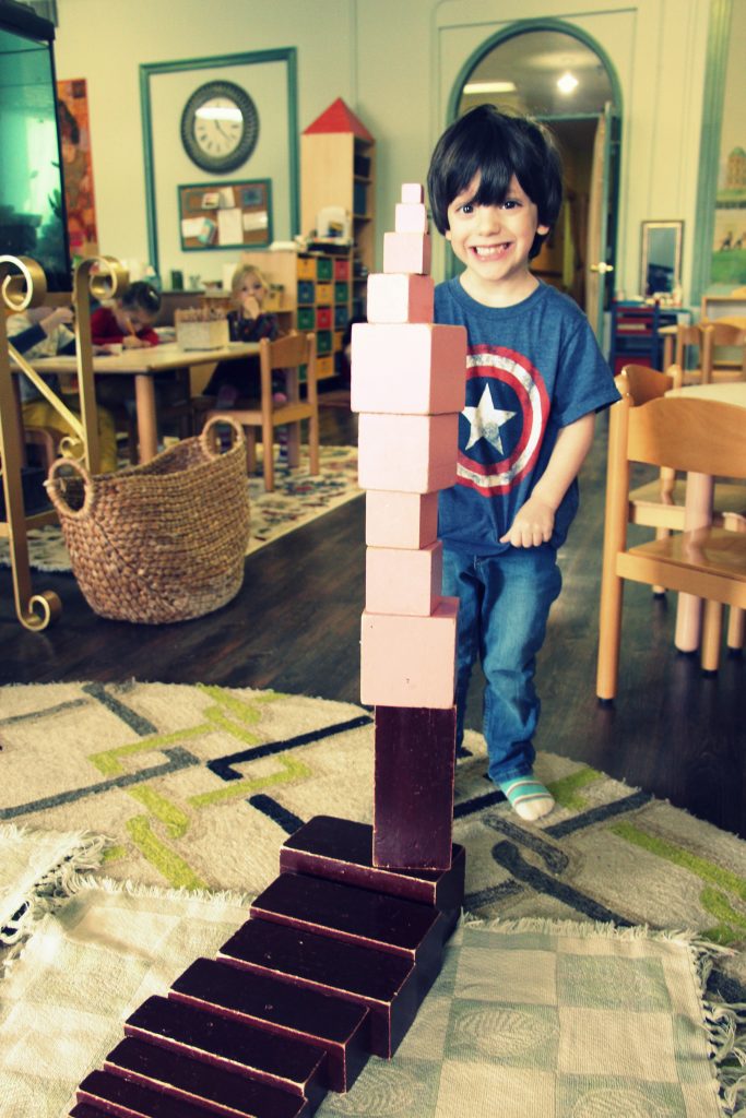 If your child has previously moved up into our studio from the Preprimary studio, you will notice that there are some familiar Montessori works that followed your child into the Primary Studio. In the Preprimary Studio, they have been practicing the basics on making order of geometric solid material, and now they are learning extensions on this material to challenge them in new ways. We offer many vocabulary words when teaching the sensorial material as we talk about grading material in size, weight, texture, color, and temperature. This material encourages children to be creative while working on their sense of order, motor skills, and problem solving skills. The brown stairs and the pink tower continue to be a Montessori staple on a universal level in Montessori schools. The following photos are just some of the examples of children engaged in the sensorial area.