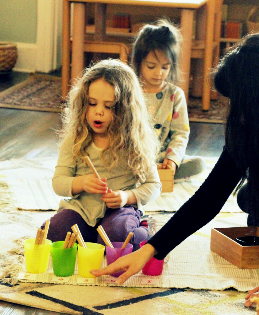 Math in our classroom is found indirectly in many subject areas as children learn to count and sort material throughout the studio. We also have a special area for math that children love to practice alone and with each other. We recently added a lot of fun and colorful math sorting activities that have kept our students very busy. In a Montessori classroom, we have sensorial material that children can hold in their hands to feel the weight of the quantity in their hands, and they use their little fingers to count out pretty beads and tiny objects.