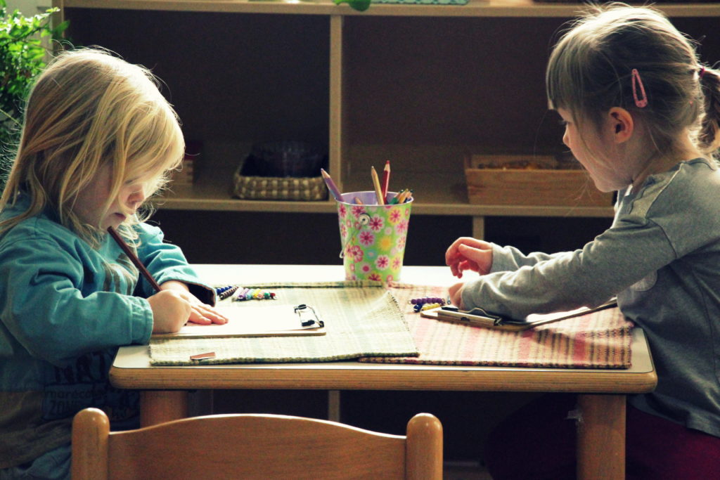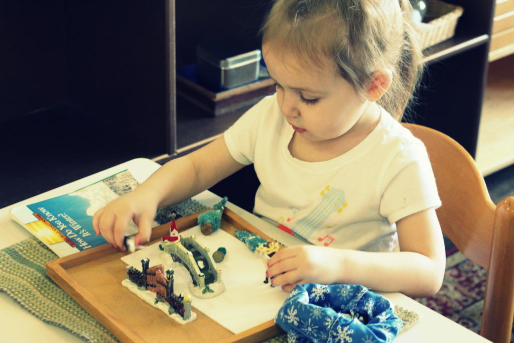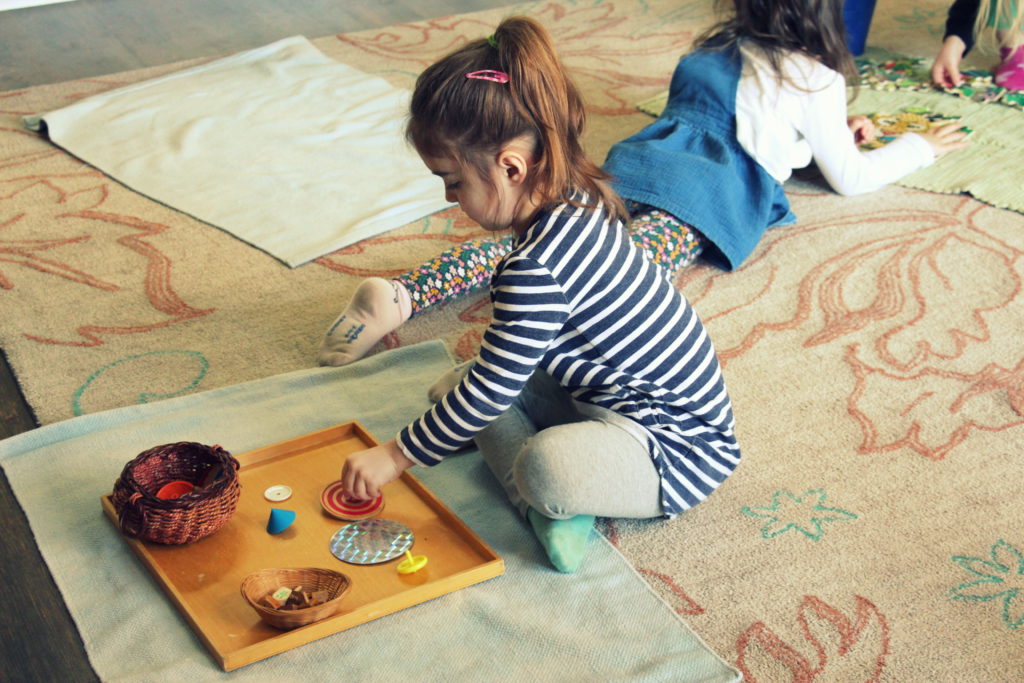 A gentle tone towards others. We talk a lot about emotions, such as what causes us to feel frustrated, upset, anxious, or angry, so that children can start being more familiar with their emotions and how to manage those emotions as they come. We let children know that it’s normal to feel angry, upset, and frustrated sometimes, but that we need to manage those feelings for a number of reasons. We want to make sure that we are not taking our angers out on others in a mean and bossy way, and that we’re not breaking rules or disrespecting people. In addition, we want children to realize that as these feelings arise, we don’t have to dwell on them. We offer children a variety of simple strategies to find ways to get to a peaceful place in our hearts, such as giving examples of phrases or simple sentences to say gently to others when they need some space. We talk about our tone in general when others approach us throughout the day to bring awareness to the feelings of others, as well as how we might feel about someone else’s tone. We encourage kind and gentle words, explaining that we need to manage those feelings before they escalate and hurt someone’s feelings.  This includes many lessons in our cozy area where we show children how to re-center, meditate, use their imagination, and find peace within.
