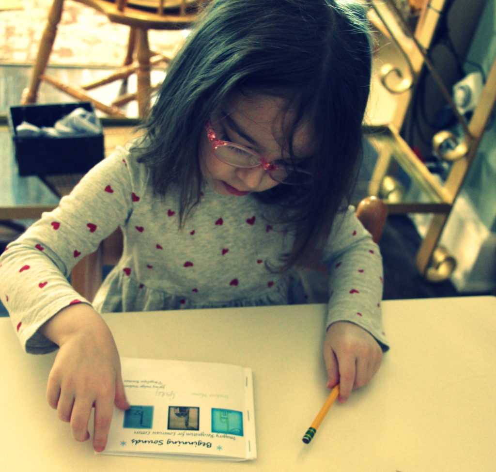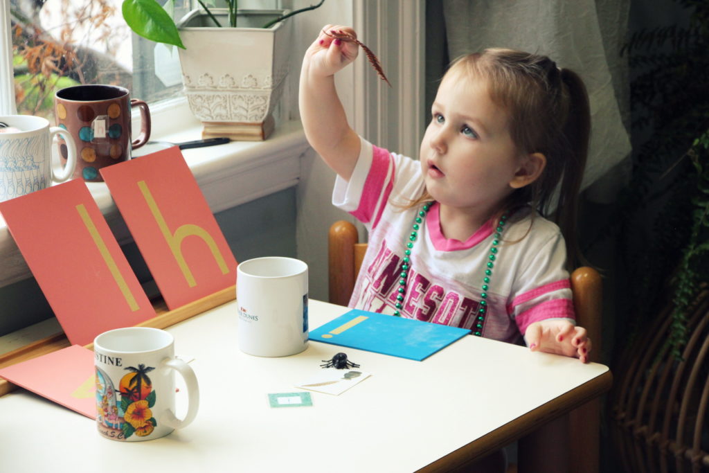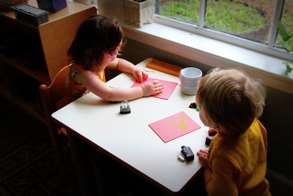 • Older children: matching beginning sounds imagery to the lowercase letter, lessons on sounding out 3 lettered nouns, tracing letters in the sand, metal insets (stencil tools that compliment the shapes of lowercase letters), story telling booklets