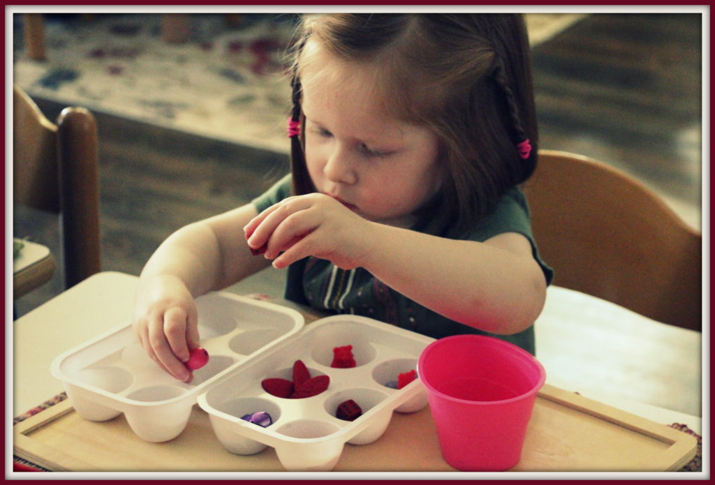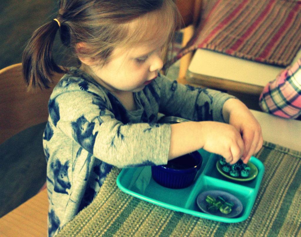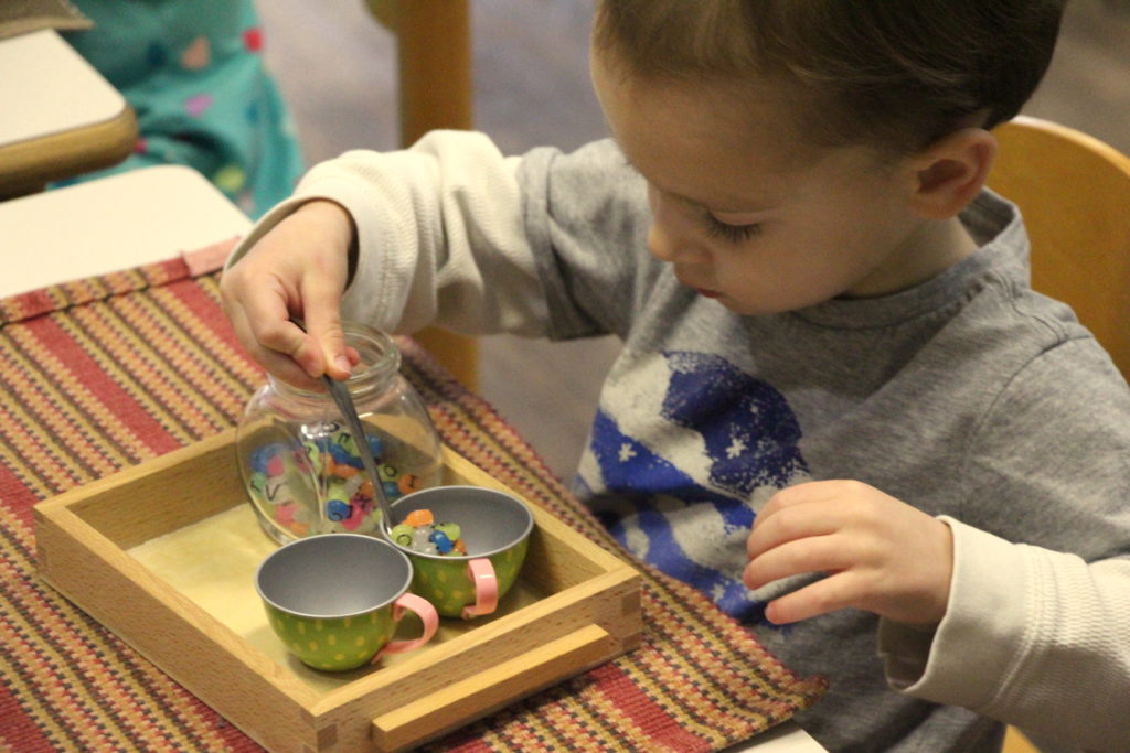 One of several practical life shelves, including grasping works, spoon works, and tong works. Materials on these shelves are changed biweekly or sooner to offer new ways to challenge our students