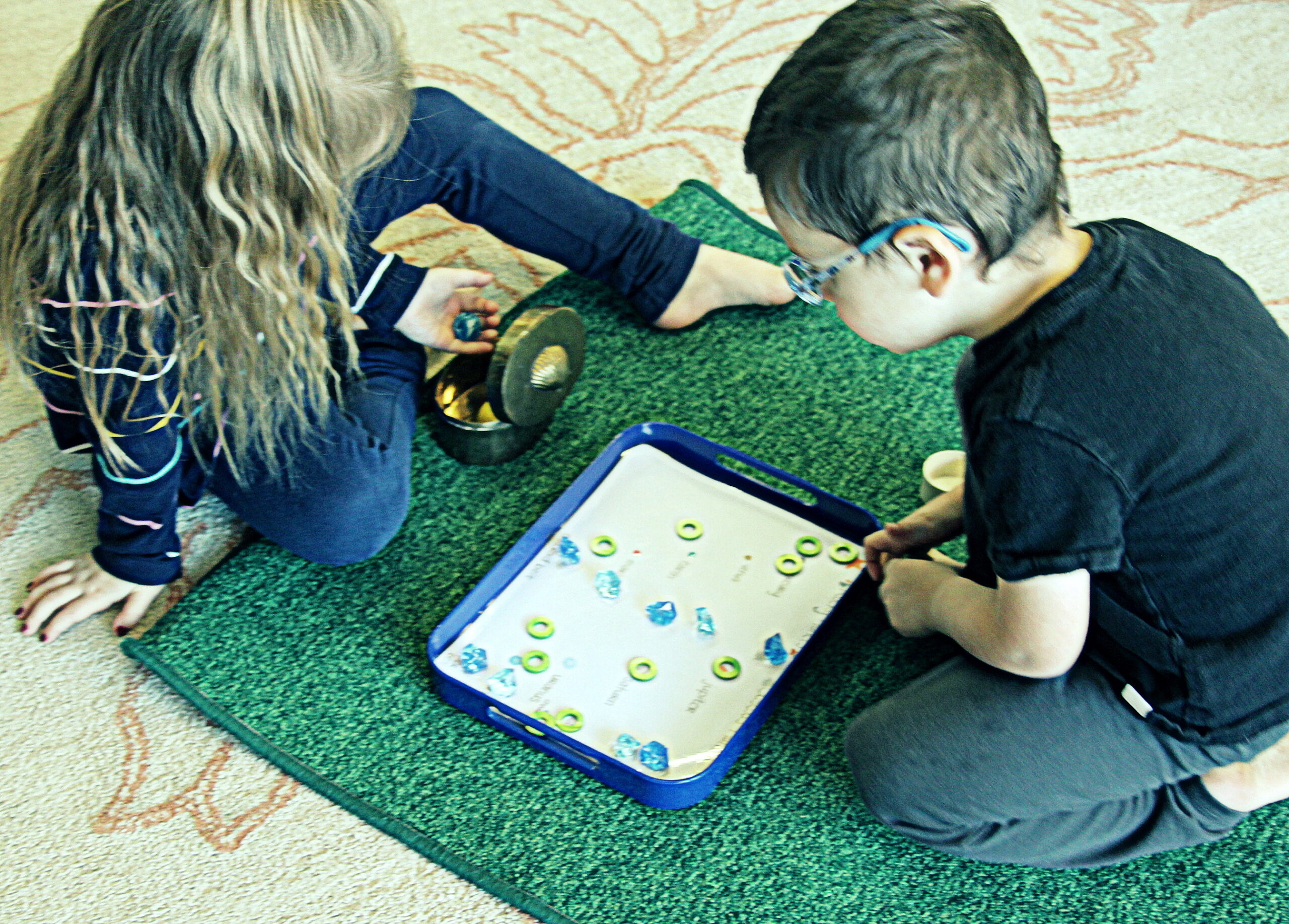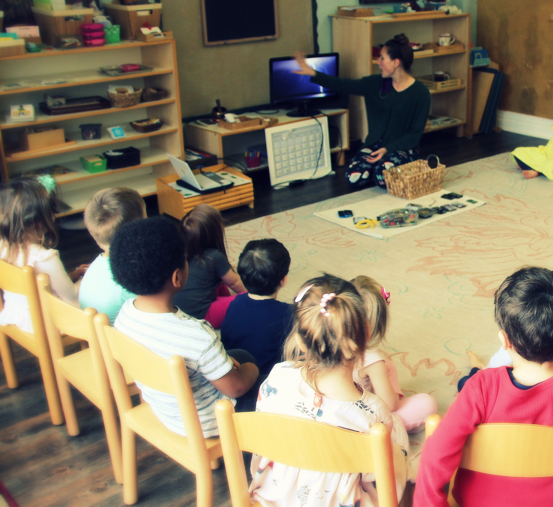 Introduction to Electricity. Trying to define electromagnetism to toddlers is actually a lot of fun! We do our best to simplify everything, and we have used a basic physics definition to explain electricity as an energy: a force with the ability to do work. We cover how electricity is omnipresent in our everyday lives, used in lighting, heating, cooling, electronics, machinery, etc. We explain that it’s everywhere, even in our bodies as our cells conduct electrical currents for our nervous system to send signals throughout our body and brain, and so on. While we don’t expect everyone to catch on to all of the technical details, we covered some basic takeaway lessons around safety, electrical circuits and on/off switches. Your children have seen diagrams showing how electrical currents can flow through materials (called conductors) and how insulators (such as rubber or plastic) are used to protect us as the electrical current can’t flow through them. Did our students catch all of that? Well, we certainly had their attention and they have truly enjoyed exploring our “broken electronics basket” where they may safely examine parts of a computer, processor chips in cameras, old cell phone parts, and more! And of course, we’ve had lessons on the magnetic field around a magnet, and each student has made their rounds trying out our new horse-shoe magnet work where they can see how opposites attract or how “the magnets like each other” and vice versa, and our classic Montessori work where they can sort through objects that are “magnetic” and “nonmagnetic.”