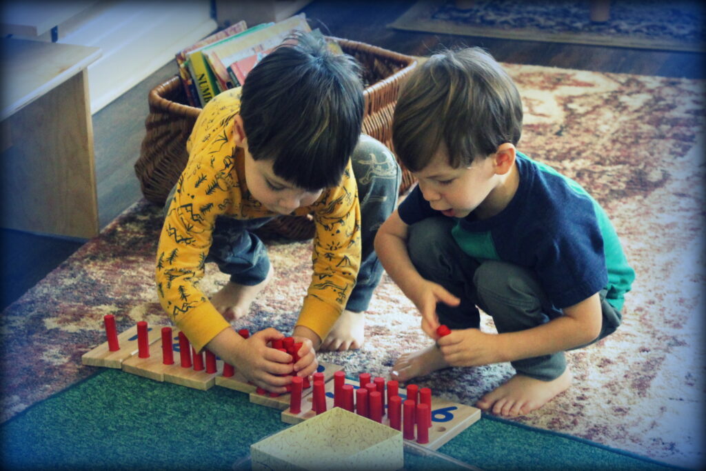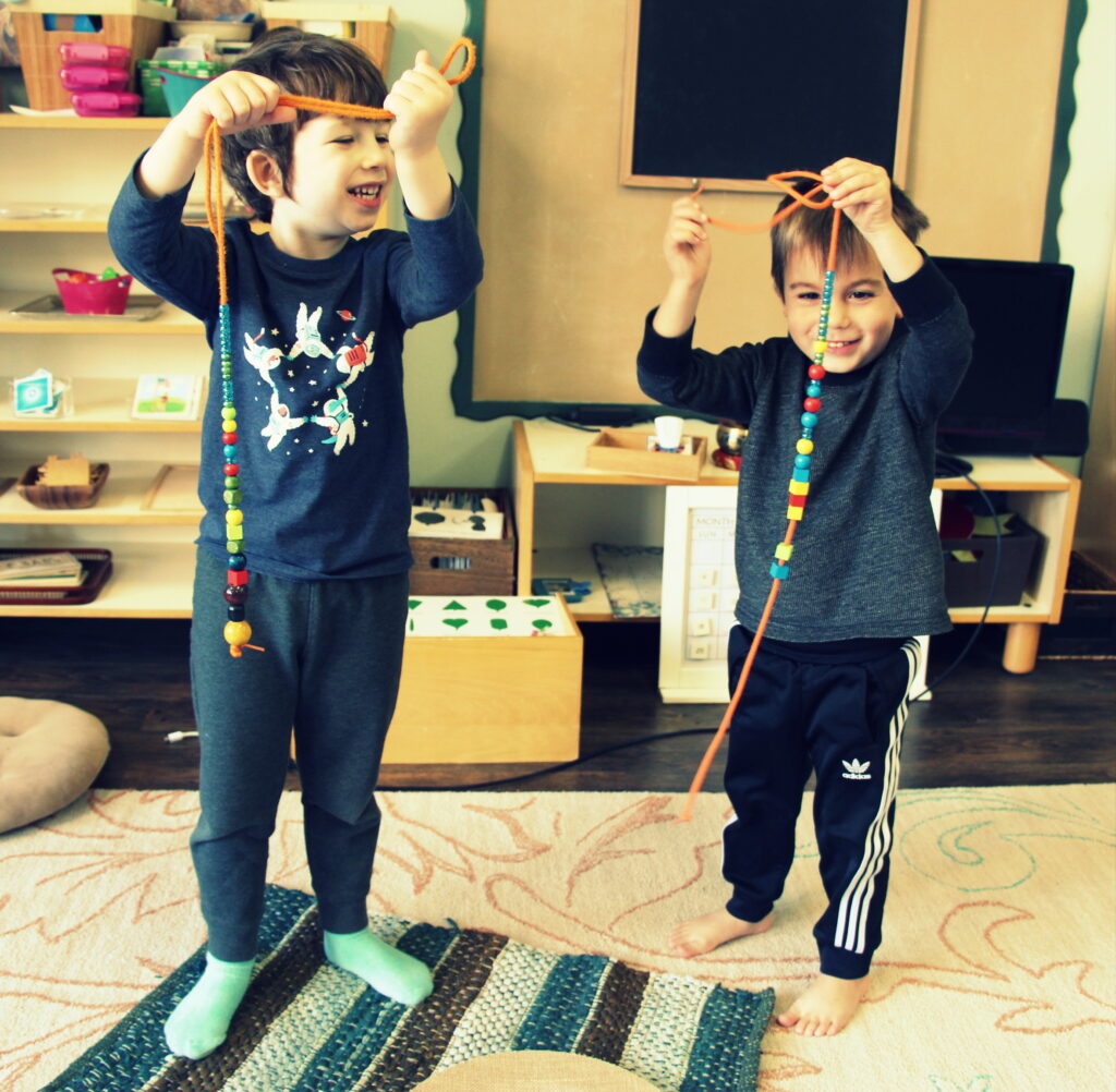 Teens & Tens. Students who recognize the digits and quantities 1 – 10 at random are learning about teens materials. This introduction involves some simple addition by adding the number 10 to any single digit. Now that they have memorized the color-coded bead chains 1 – 10, they have also been introduced to the idea of skip counting by tens, from 10 – 40.