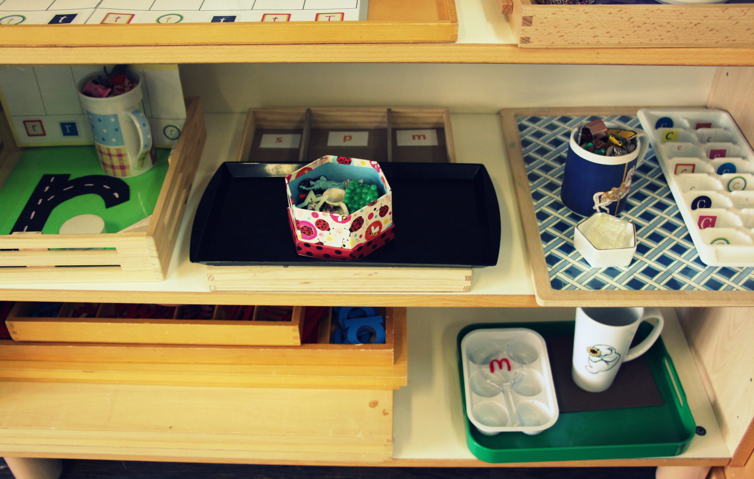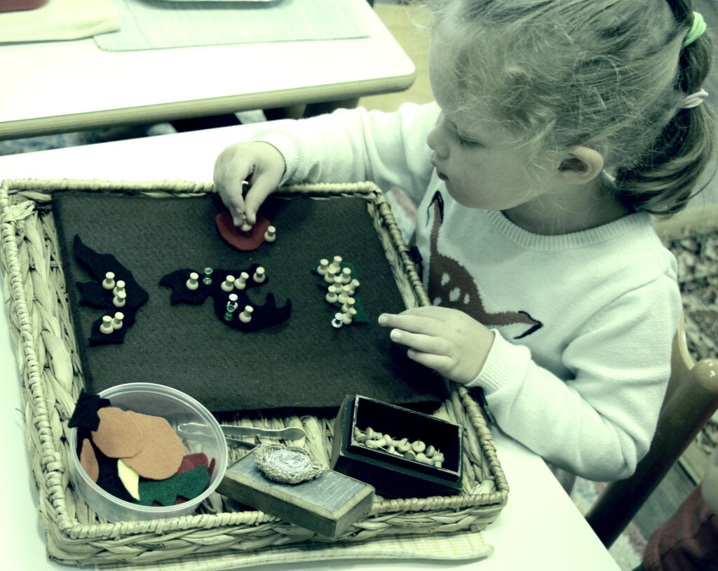 Beginning Sounds. We continue to expand on beginning sounds groupings, and your children have recently been introduced to the 3rd letter set (intentionally in lowercase):  b/f/o/g.  We have consolidated some of our single letter works from the past two sets (s/m/a/t & c/r/i/p), to sort through and organize “beginning sounds objects” under the appropriate letter sound, a fun memory exercise for all of our students.