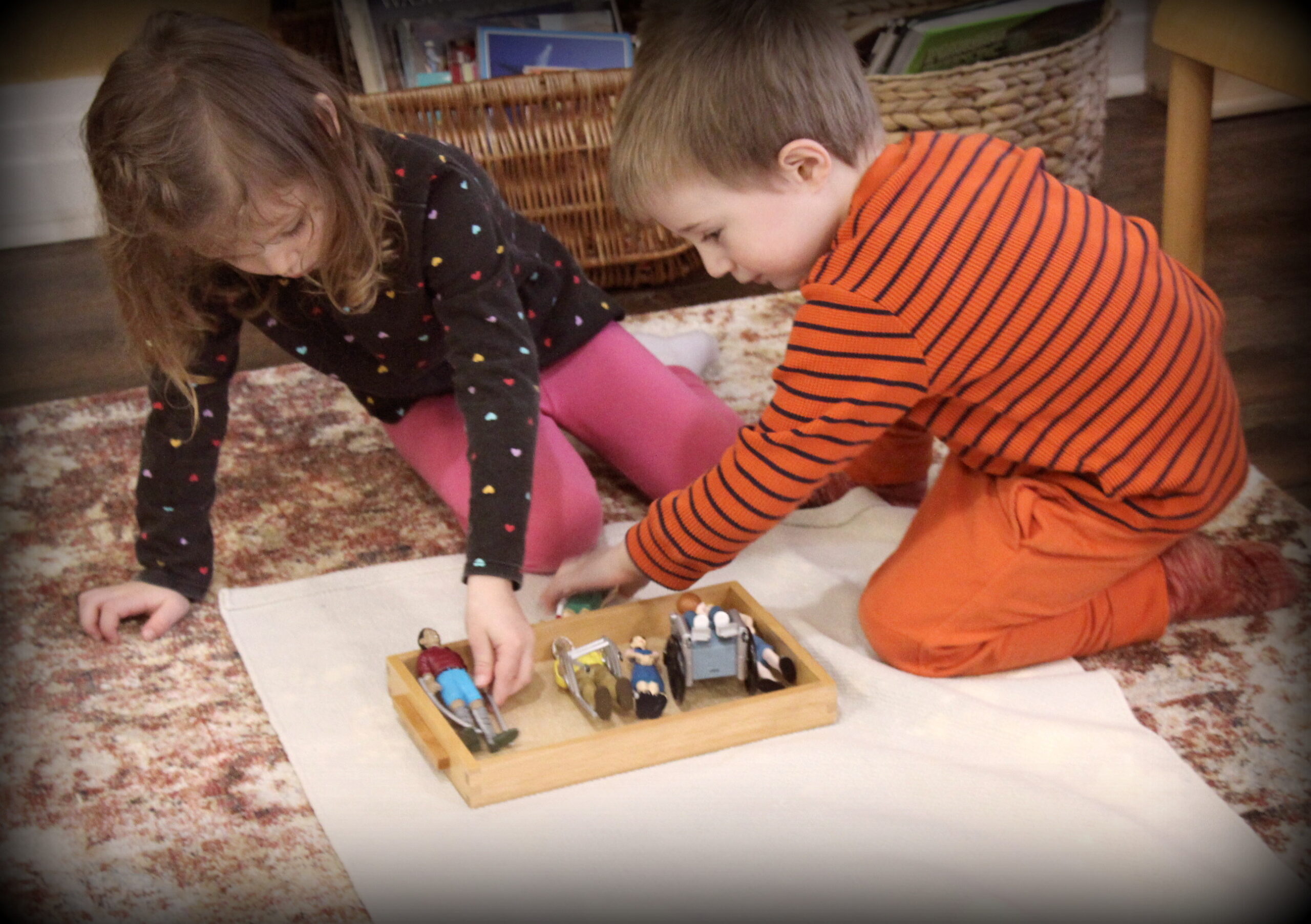 Fall Basket. During our presentation for this work we read, “How do you know it’s Fall?,” by Allan Fowler, followed by a group discussion on the early signs of fall. Children may create their own fall scene and are encouraged to act out their own fall stories with the figurines and objects included.