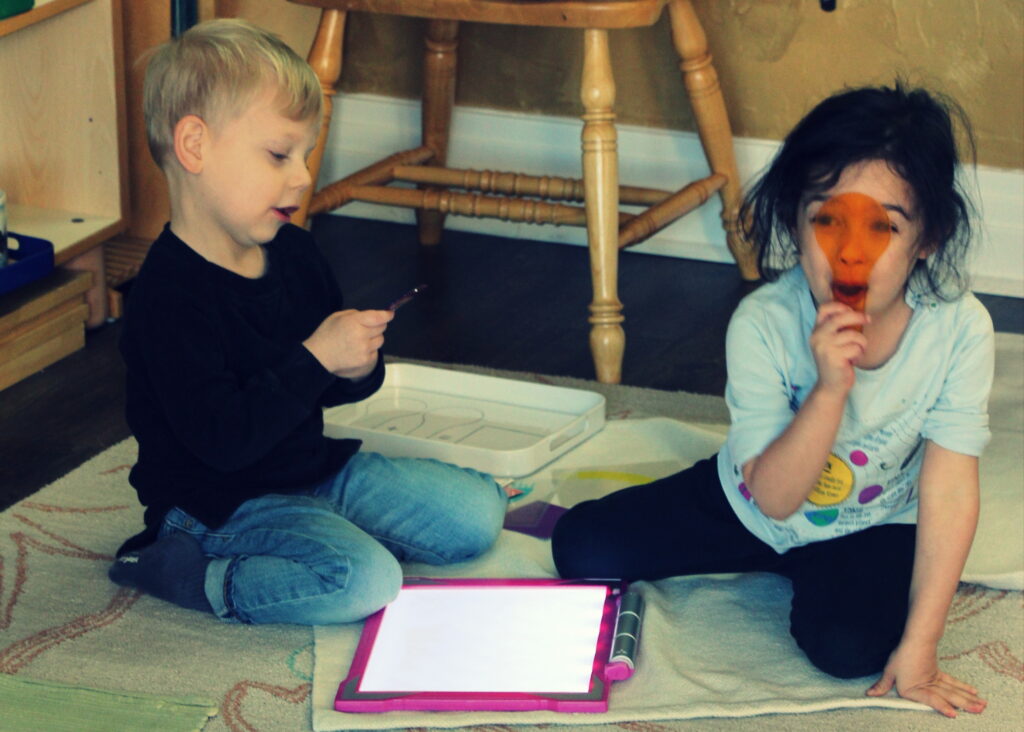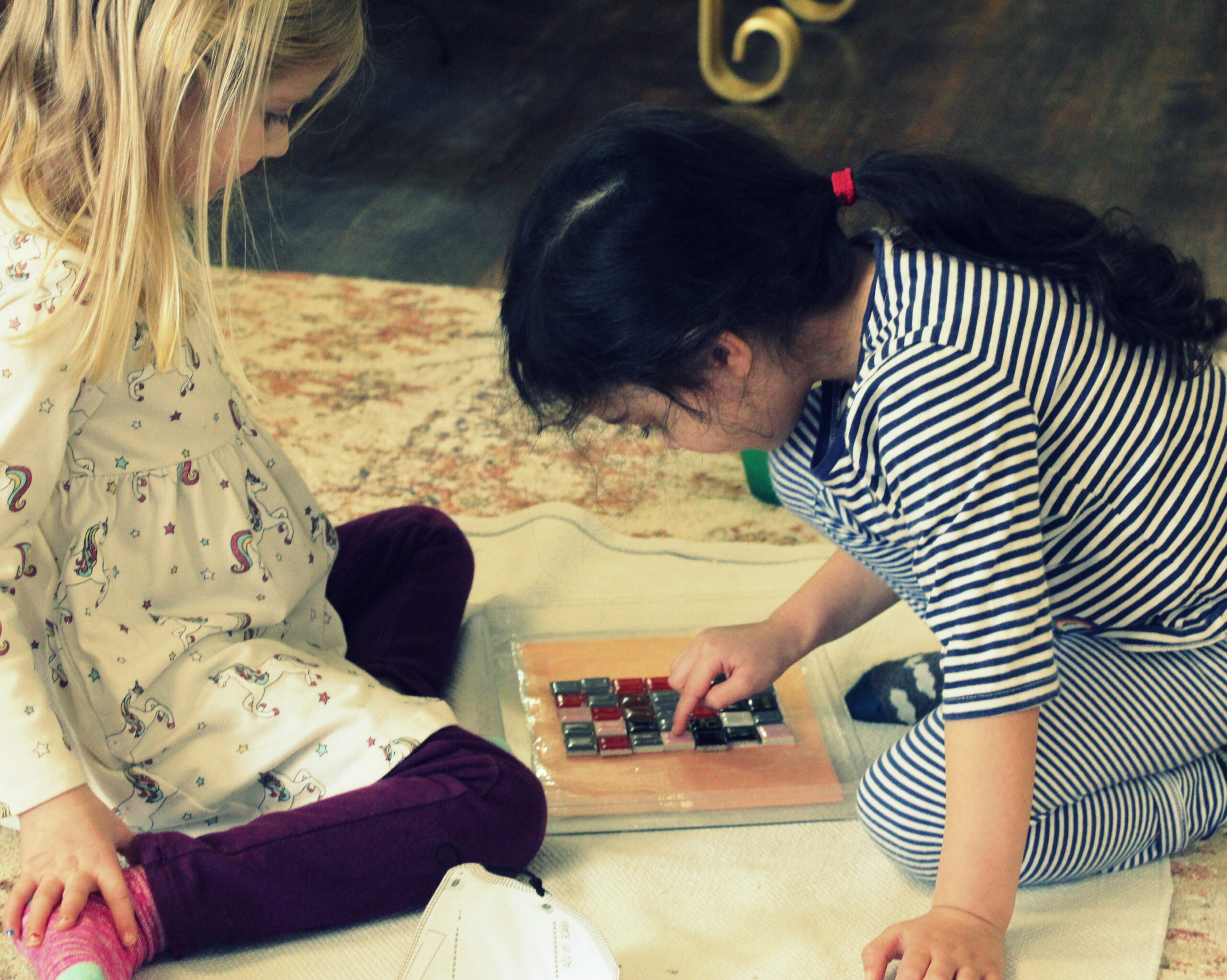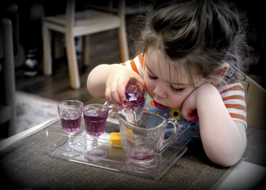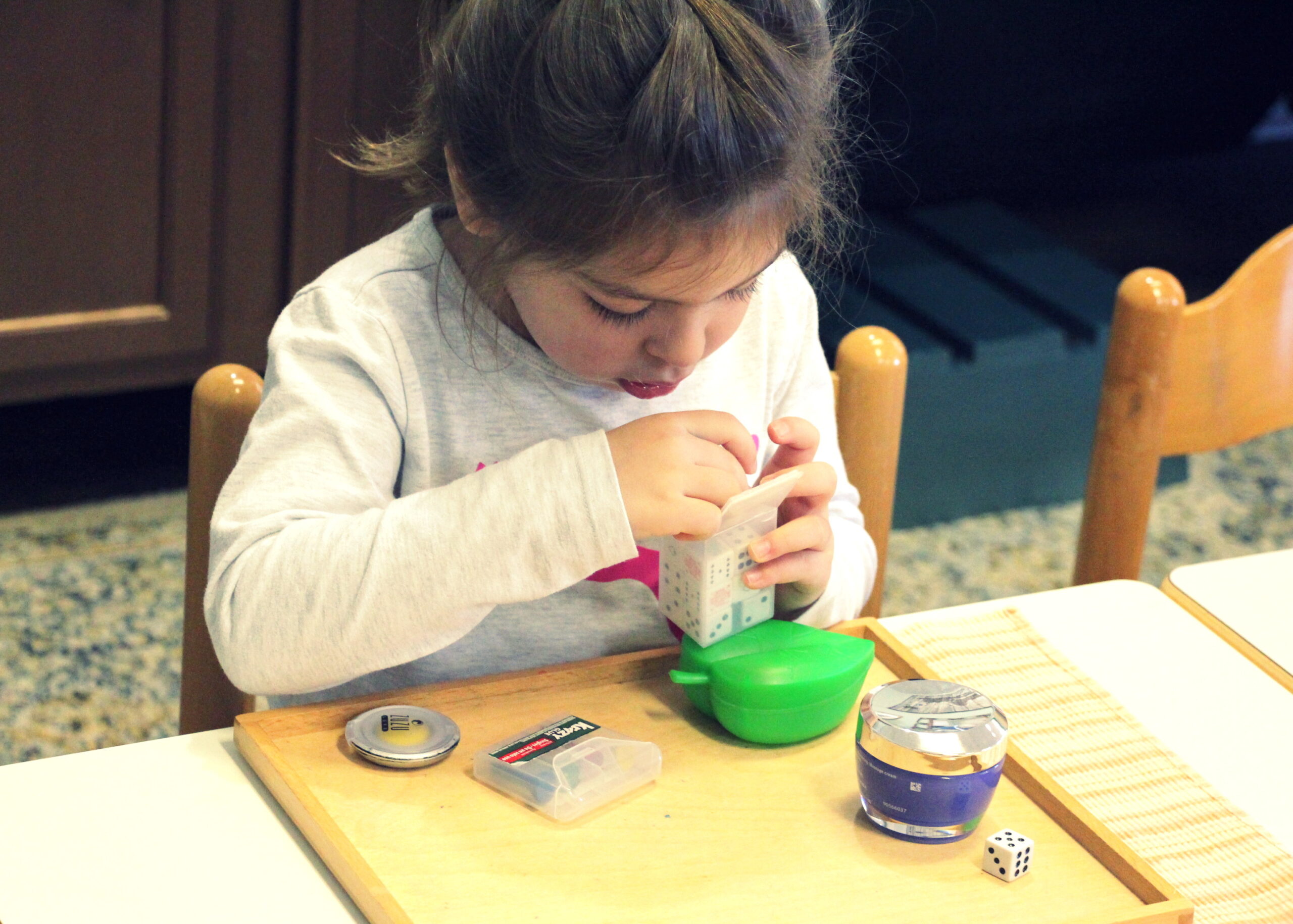 - Pin Poking: learning to take a push pin and poke holes around a tiny shape to “pop the shape out of the paper,” for building coordination and refining the pincer grip