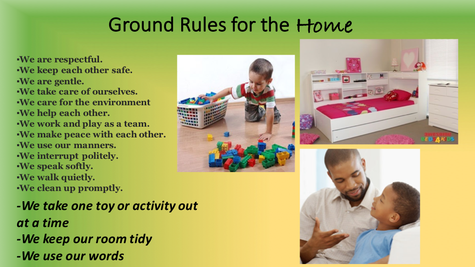 We don’t just talk about respecting the material in our environment at school, we talk about care for self and others, and all of these topics fall under a list of “ground rules” to keep our classroom and students feeling content, interested, productive, and safe. Going over these rules with examples and discussion questions about feelings, etc. can help to build a safe environment. That said, there’s no reason you can’t have some rules or general expectations and practices laid out like this for your own home to help your child to build respect for the safety and tone that your home provides.
