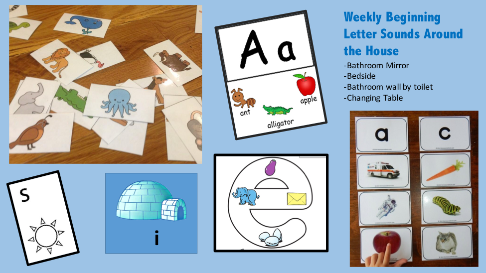For older students who know their common letter sounds, use the same approach as above by adding some double letter sounds that are tricky blends like th from “three,” cr from “crab,” or ee in “bee.” Once you have a kindergartener, site words can be randomly placed around the house. Action words, description words, and simple sentences are also something that you can add to the mix, depending on your child’s understanding.
