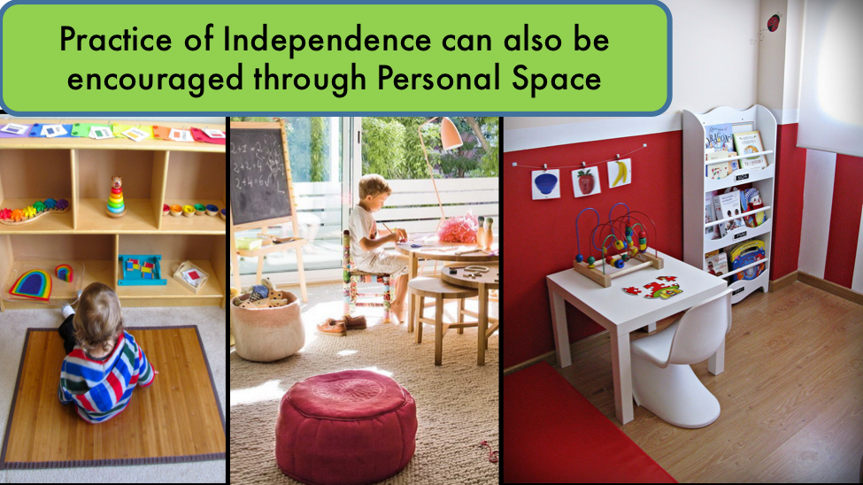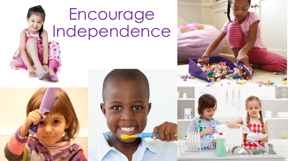 To encourage independence, it’s helpful to acknowledge your child at times by making statements and facts, rather than praises, so that they aren’t trying to just please you, rather, they’re finding pride in themselves and their abilities. Acknowledge them with facts such as, “you put your own shoes on / you combed your hair neatly / your teeth look so sparkly clean / you made some very interesting patterns with those blocks / what a thoughtful and colorful drawing,” etc.