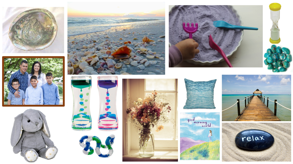 Ideas for your cozy corner: beautiful imagery, found objects, sand timers, fidget toys, zen garden, etc.