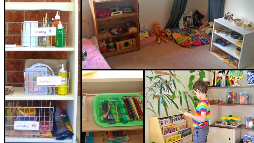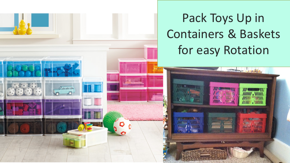 Notice which toys are being neglected in a big toy room full of toys and consider packing some things up. Just as we rotate material in the classroom to draw in interest, there’s no reason you can’t rotate toys. Taking some toys away for a little while can bring new life and interest to them later when it’s time to switch out (and plus, you don’t find the need to buy new things all of the time to draw their interest back in). Sound overwhelming? Put a few toys away every other day until the job gets done. You and your child will ultimately be happier with less clutter. Rotating toys and being able to clearly see on a shelf what you’ve got to work with brings a new appeal to the material. Adding a tray or basket to contain the toys and making a special place for that toy or toy set can also add value and draw interest in a new light.