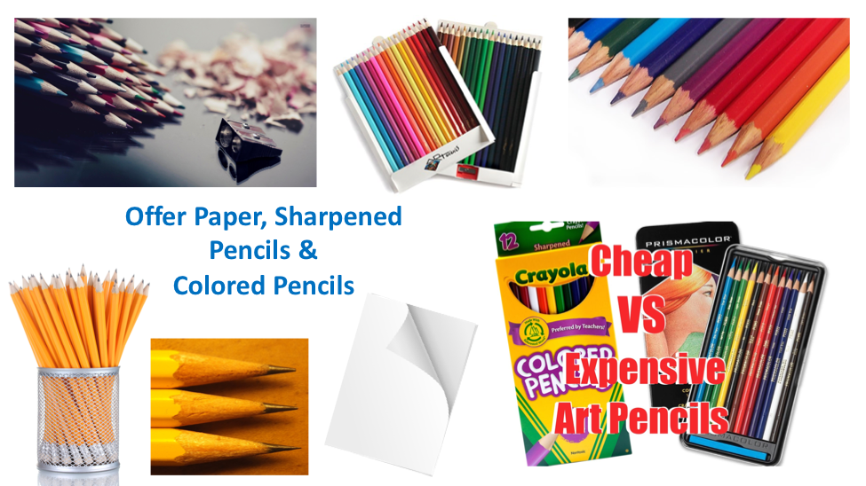 Good quality sharpened pencils go a long way. Keep pencils & colored pencils sharpened, which requires some work on your end to check a couple of times a week, but it’s worth it if your kid loves art. Good quality pencils can prevent them from getting discouraged as they work on their pincer grip, building coordination, drawing fine lines and more. Don’t waste your money on cheap colored pencils. The tips often break and they don’t sharpen well. Purchase a nice colored pencil set and a sharpener – they will sharpen better, there’s less breakage, and they last longer, and the grip is better (especially if you choose a hexagonal shaped pencil). Please reach out for brand recommendations as we only use the best, for a reasonable price, in our classroom and in the home.