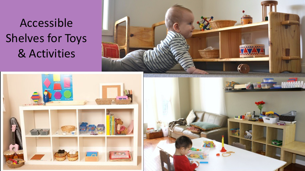 Create organized spaces such as low shelving where your child can take one toy or activity out at a time to practice creativity, caring for their belongings, and putting things back when they are finished. If your child has tons of toys all over the place and it’s hard for you to envision making room for organized areas like this, it’s never too late for “spring cleaning.” I realize that finding the time is difficult, but if you can get some helping hands to give you some windows to organize, starting all over again to reset the tone and encourage constructive play could pay off in the long run. Keeping a good number of toys in storage and periodically rotating them by offering only a manageable amount at a time can bring peace and order back into your environment.
