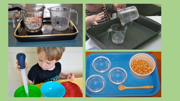 Find a tray and set up some bowls or cups with water, or offer some lentils or rice that you never got around to cooking, and let your child practice pouring, scooping, sifting, mixing, and using other various kitchen utensils that you aren’t using for dinner that evening. Here are some images to give you ideas for making your own “works.”